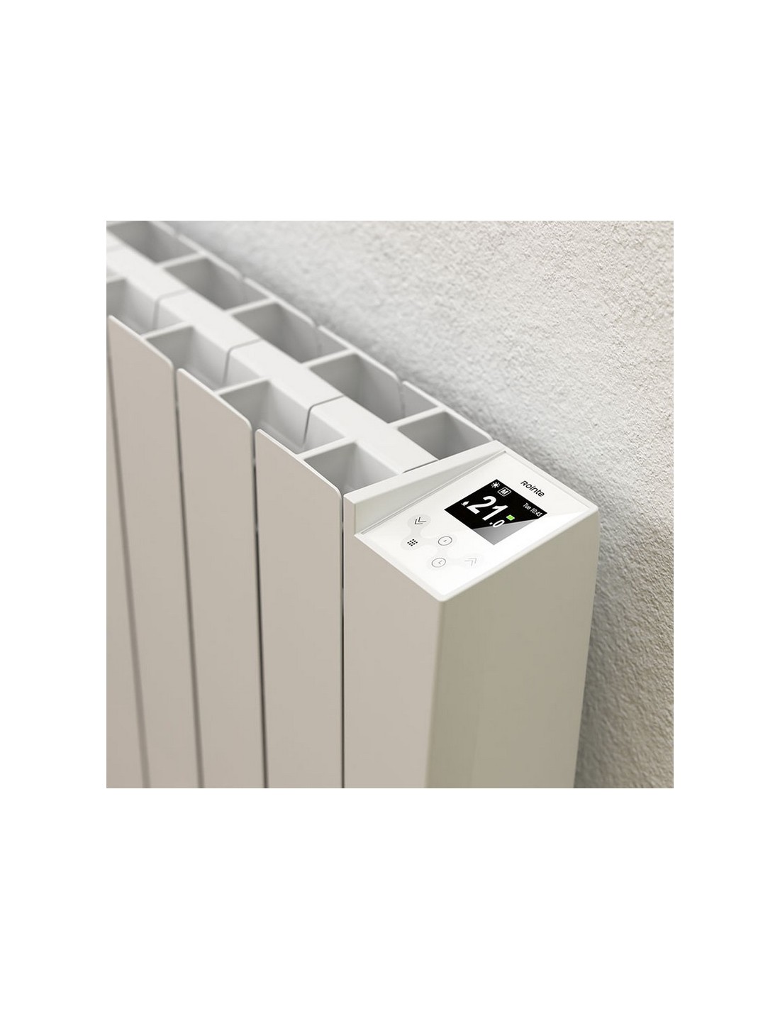 Emisor térmico con fluido ROINTE Kosmos Cuerpo 100% aluminio reciclado. Pantalla TFT 1,77". Módulo Wi-Fi direct incluído. Control voz Alexa y Google assistant. 4 programas pre-instalados + 1 libre programación. Funciones Anti-hielo, Eco, Confort y Ventanas abiertas. 500 W. 43x9,5xh.57,5 cm.