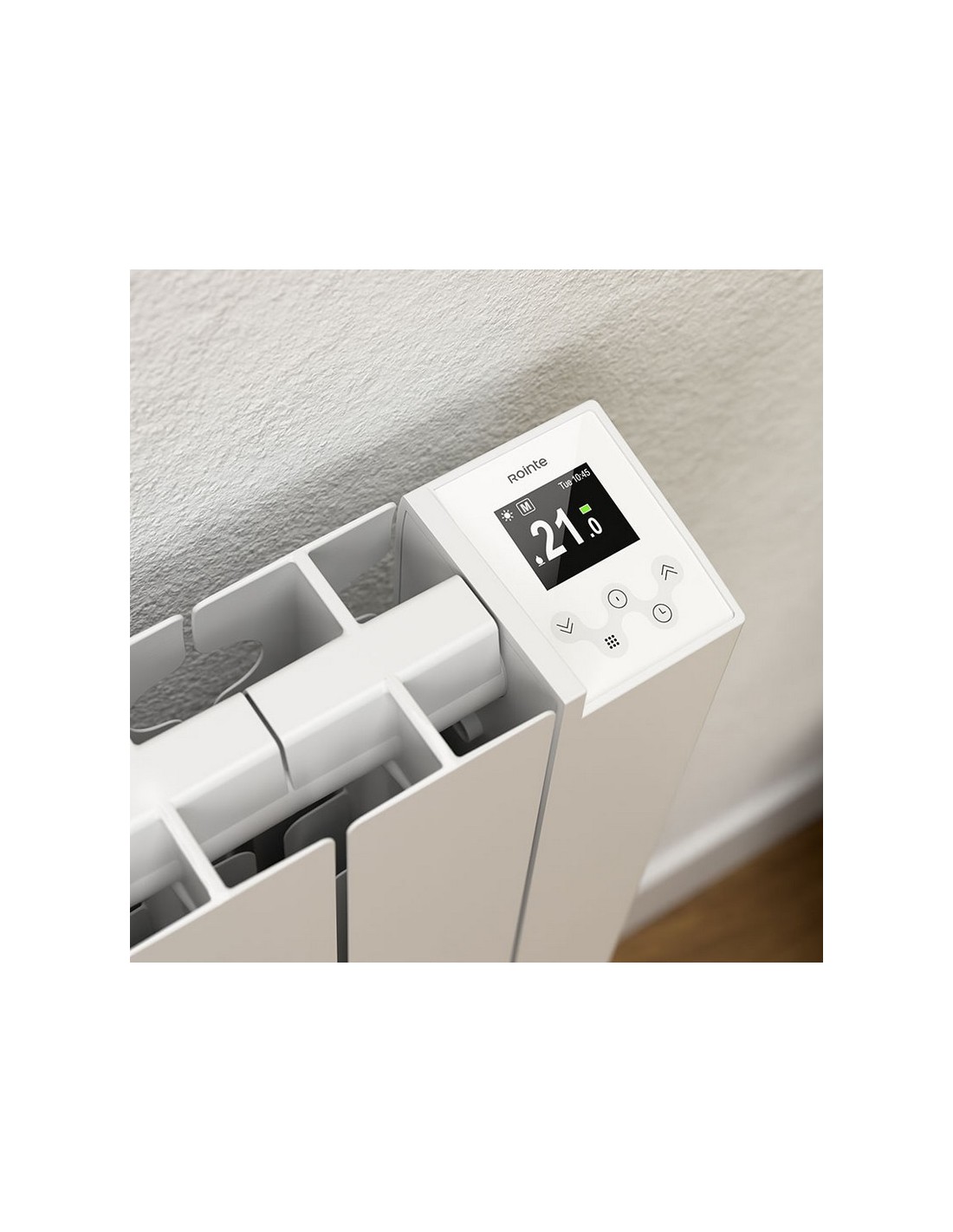 Emisor térmico con fluido ROINTE Kosmos Cuerpo 100% aluminio reciclado. Pantalla TFT 1,77". Módulo Wi-Fi direct incluído. Control voz Alexa y Google assistant. 4 programas pre-instalados + 1 libre programación. Funciones Anti-hielo, Eco, Confort y Ventanas abiertas. 1.500 W. 107x9,5xh.57,5 cm.