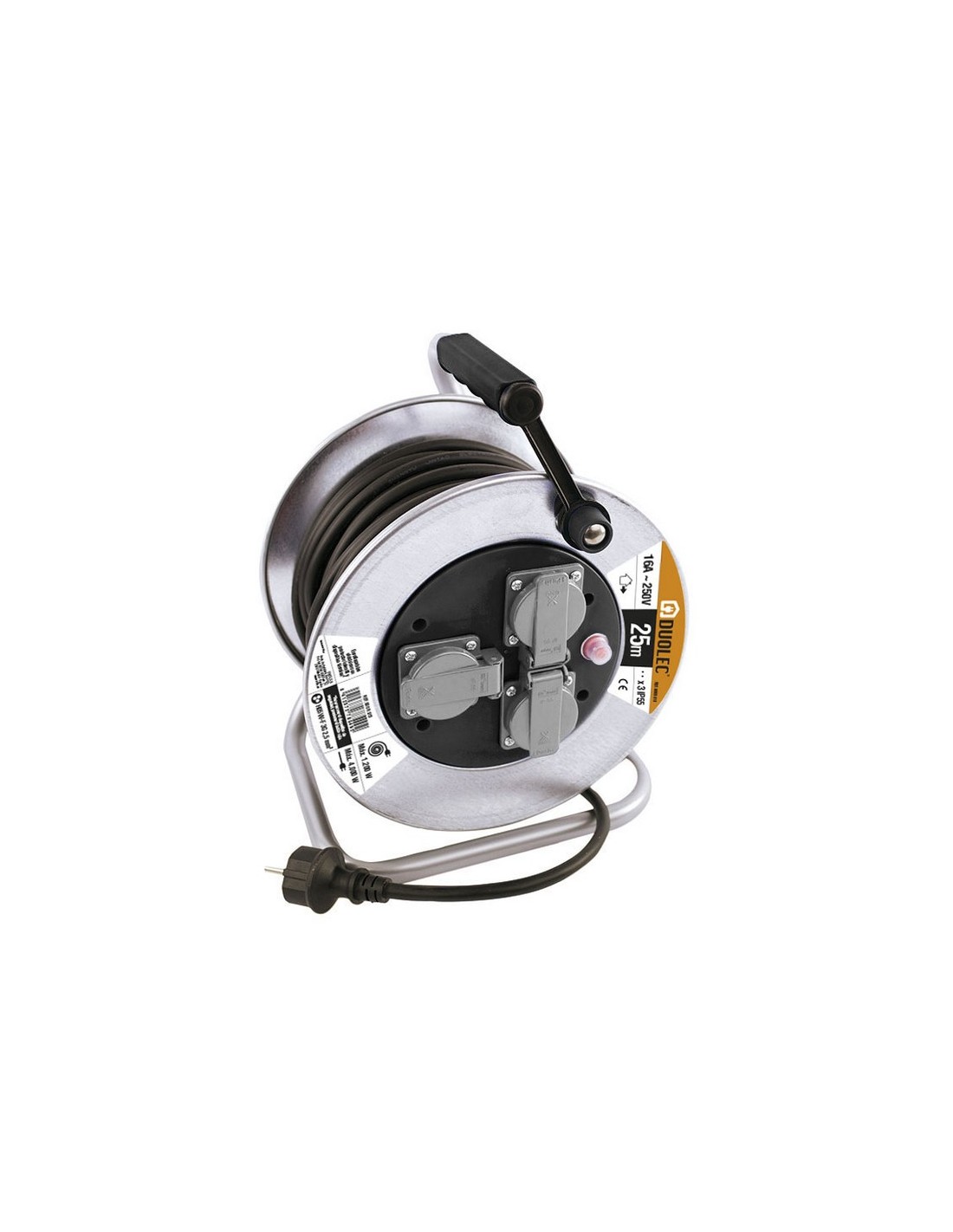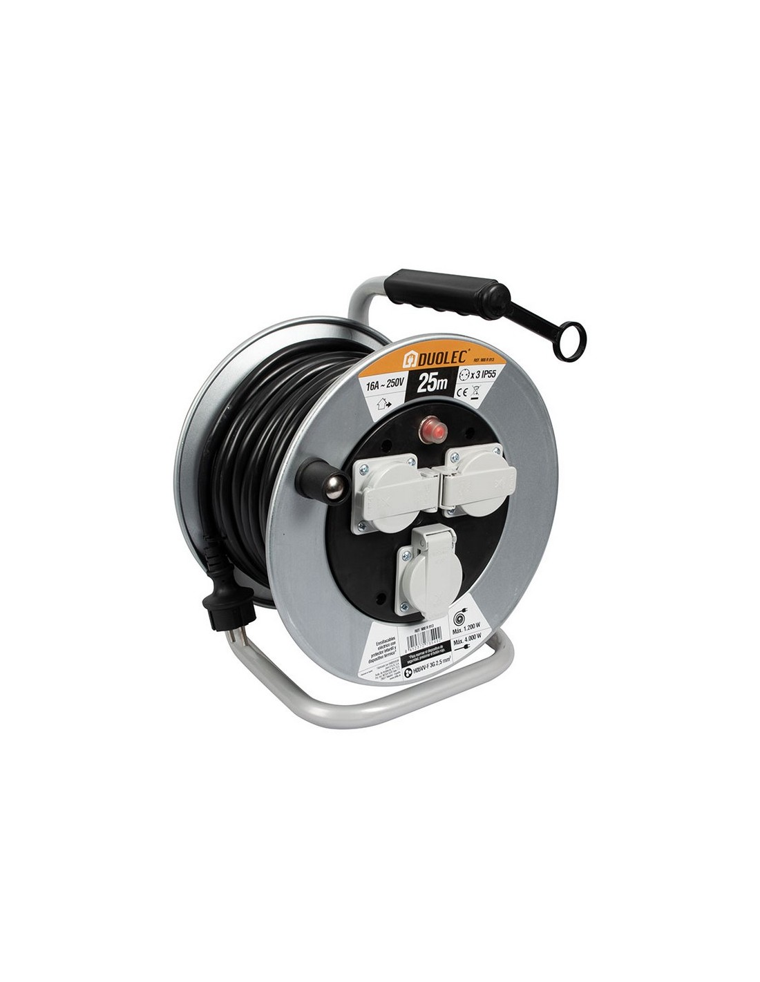 Enrollacable metálico profesional DUOLEC 3 tomas con tapa, T/T lateral. Cable H05VV-F 3G2.5. Interruptor de proteccion térmica. Potencia máxima admisible cable desenrollado 4.000 W. Cable enrollado 1.200 W. Tensión 16A/250V. IP55. Fabricación nacional. 25 m.