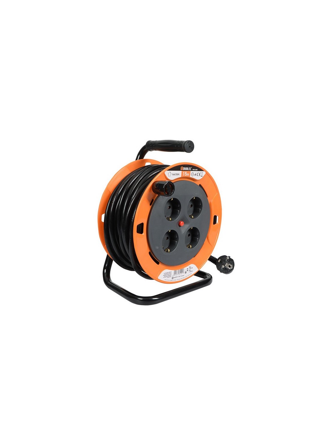 Enrollable profesional DUOLEC 4 tomas T/T lateral. Cable H05VV-F 3G1.5. Interruptor de protección térmica. Potencia máxima admisible cable desenrollado 3.000 W. Cable enrollado 1.000 W. Tensión 16A/250V. Protección infantil. Tirador extensible. Placa para fijar el carrete durante el transporte. IP20. 15 m.