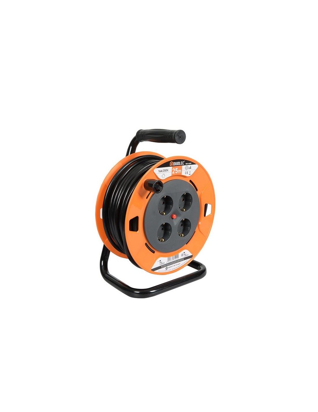Enrollable profesional DUOLEC 4 tomas T/T lateral. Cable H05VV-F 3G1.5. Interruptor de protección térmica. Potencia máxima admisible cable desenrollado 3.000 W. Cable enrollado 1.000 W. Tensión 16A/250V. Protección infantil. Tirador extensible. Placa para fijar el carrete durante el transporte. IP20. 25 m.