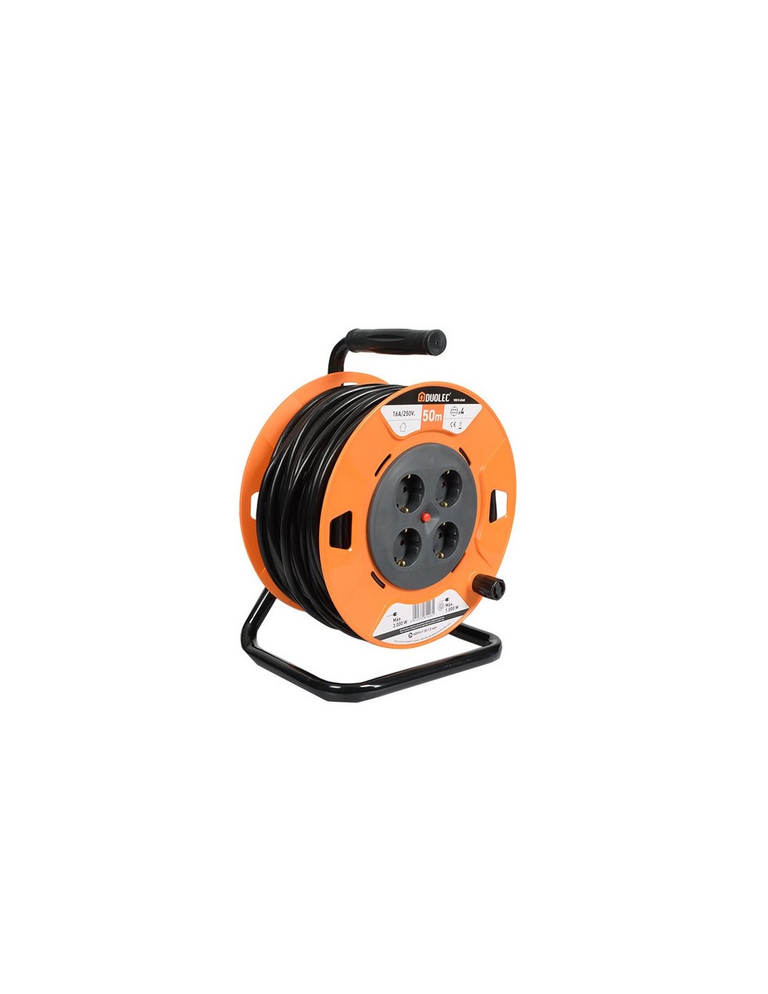 Enrollable profesional DUOLEC 4 tomas T/T lateral. Cable H05VV-F 3G1.5. Interruptor de protección térmica. Potencia máxima admisible cable desenrollado 3.000 W. Cable enrollado 1.000 W. Tensión 16A/250V. Protección infantil. Tirador extensible. Placa para fijar el carrete durante el transporte. IP20. 50 m.
