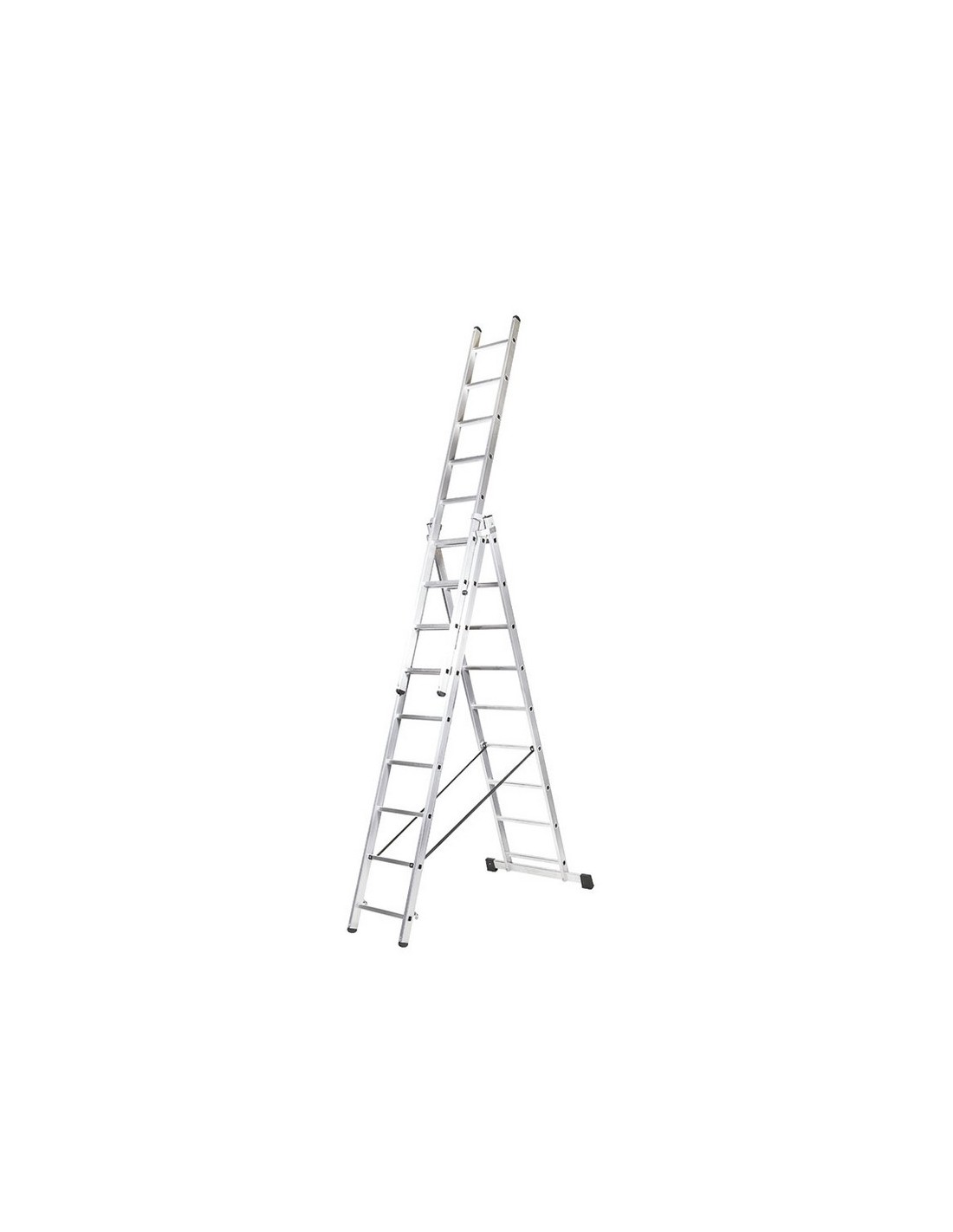 Escalera transformable aluminio ALTIPESA 3 tramos. Barra establizadora, conteras PVC. Guías exteriores de deslizamiento en aluminio. Cinta de seguridad antiapertuta nilón. 3x9 peldaños.