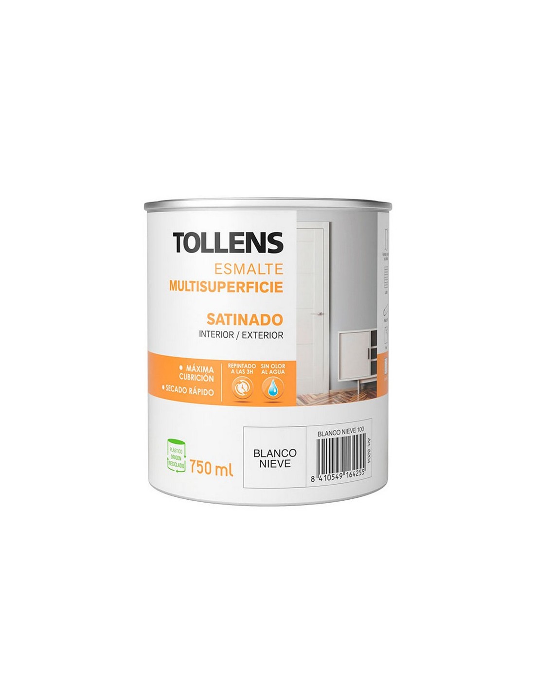 Esmalte al agua multisuperficie TOLLENS Satinado Máxima cubrición y secado ultra rápido para pintar puertas, muebles y objetos en interior y exterior. Secado ultra rápido, repintado a las 3 horas. Sin olor. No amarillea. 750 ml. Blanco nieve.