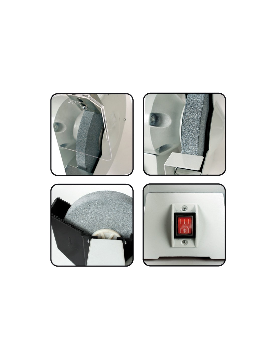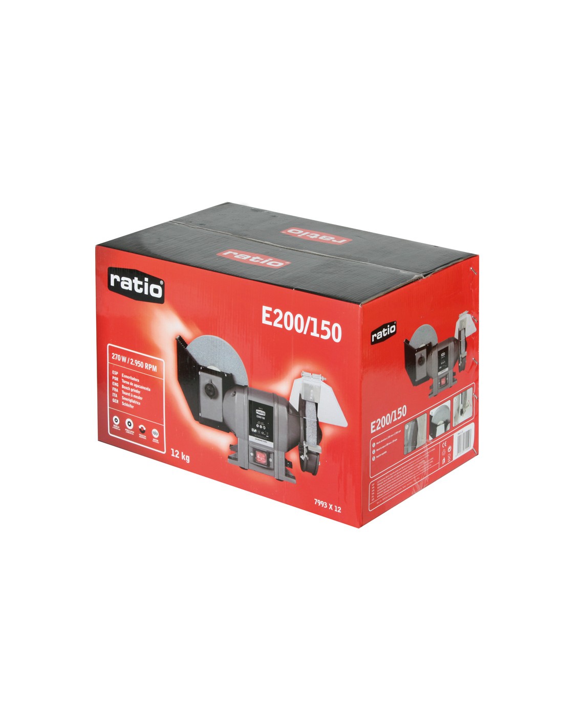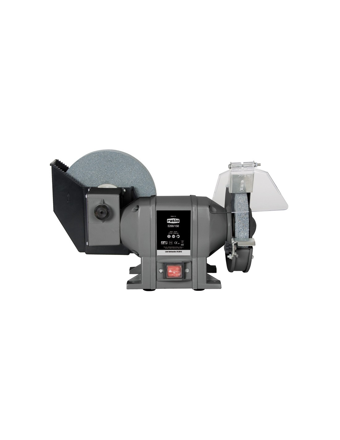 Esmeriladora RATIO E200/150. Carcasa de acero. Motor silencioso con rodamientos de bolas. Adecuada para trabajos generales de taller. Depósito de agua para muela 200x40x20 mm. Incluye muelas y protectores. Potencia: 270 W.