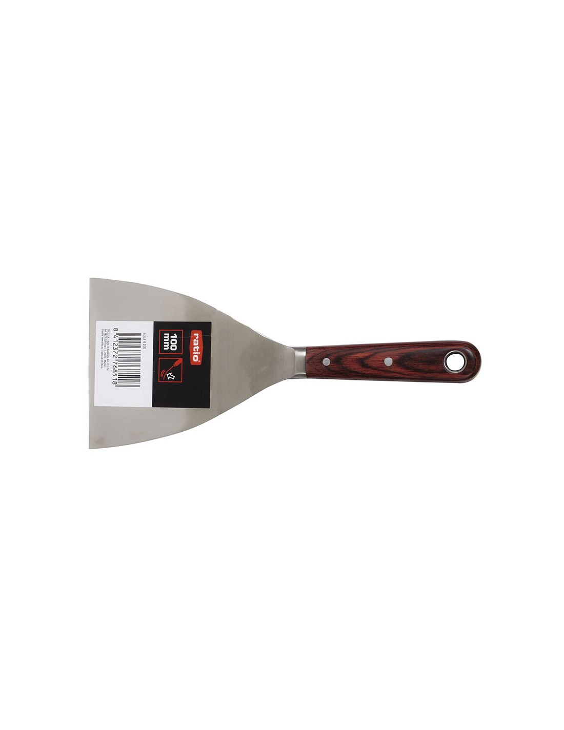 Espátula pintor RATIO acero inox. Hoja en acero inoxidable flexible y pasante hasta el mango. Mango madera de 105 mm largo. Espesor hoja: 1,5 ~ 0,5 mm. 100 mm.