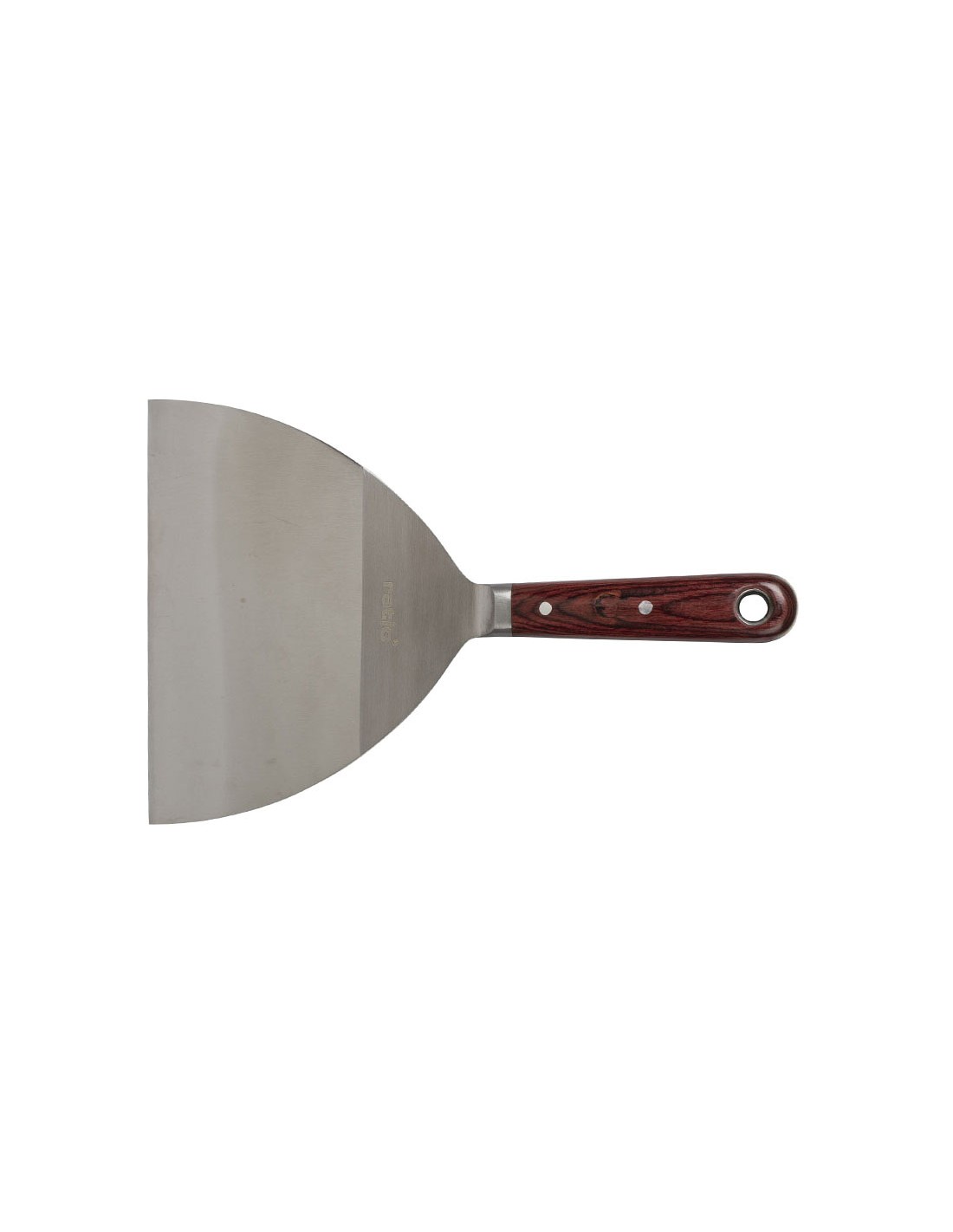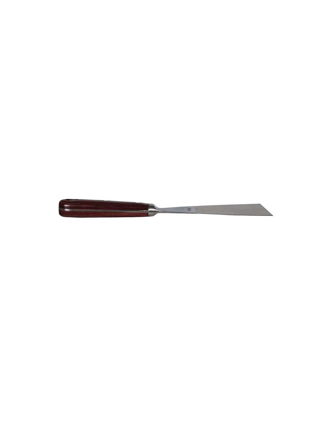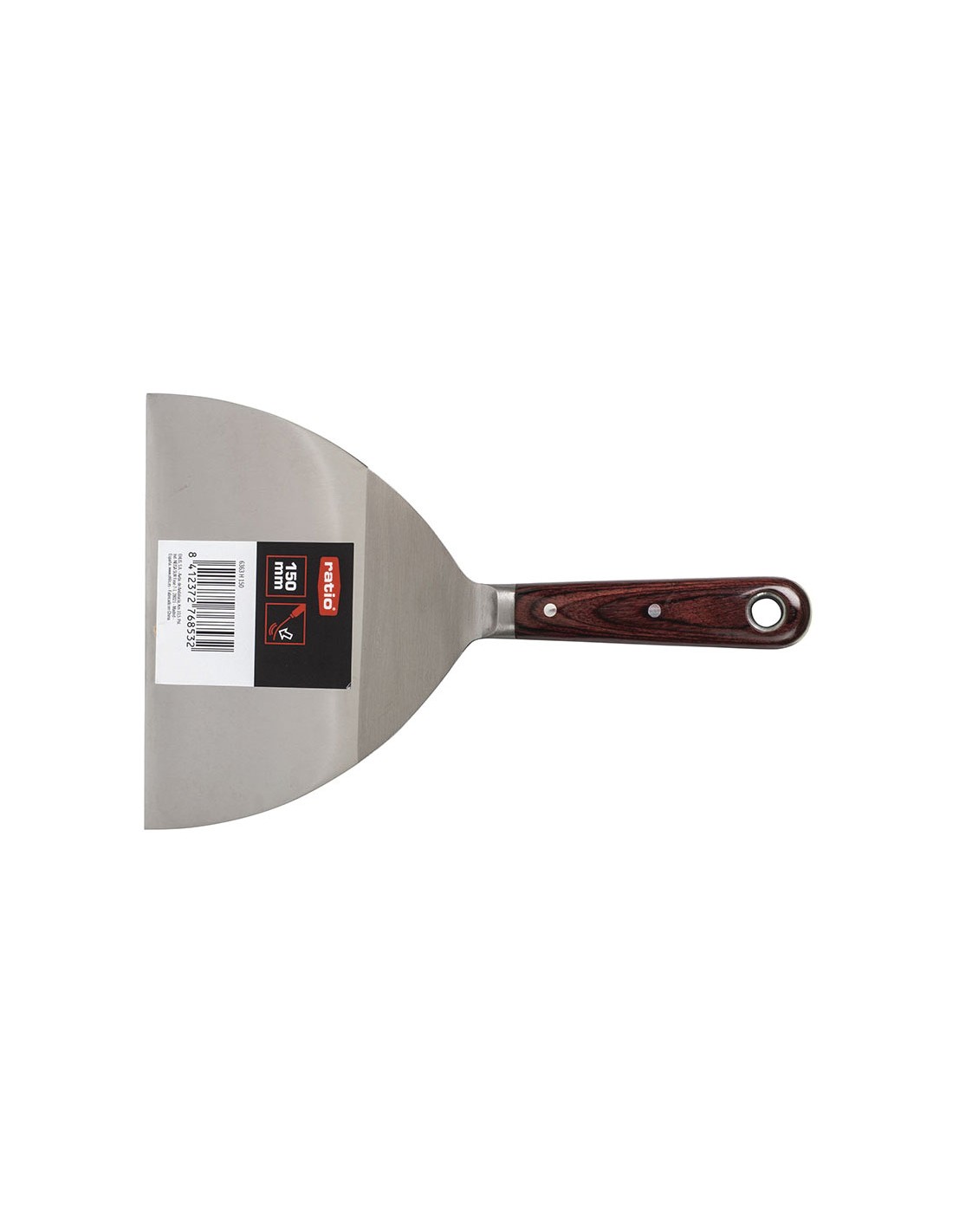Espátula pintor RATIO acero inox. Hoja en acero inoxidable flexible y pasante hasta el mango. Mango madera de 105 mm largo. Espesor hoja: 1,5 ~ 0,5 mm. 150 mm.