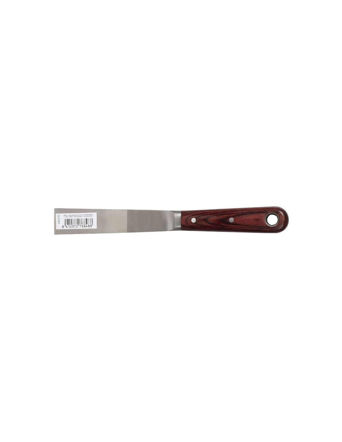 Espátula pintor RATIO acero inox. Hoja en acero inoxidable flexible y pasante hasta el mango. Mango madera de 105 mm largo. Espesor hoja: 1,5 ~ 0,5 mm. 25 mm.