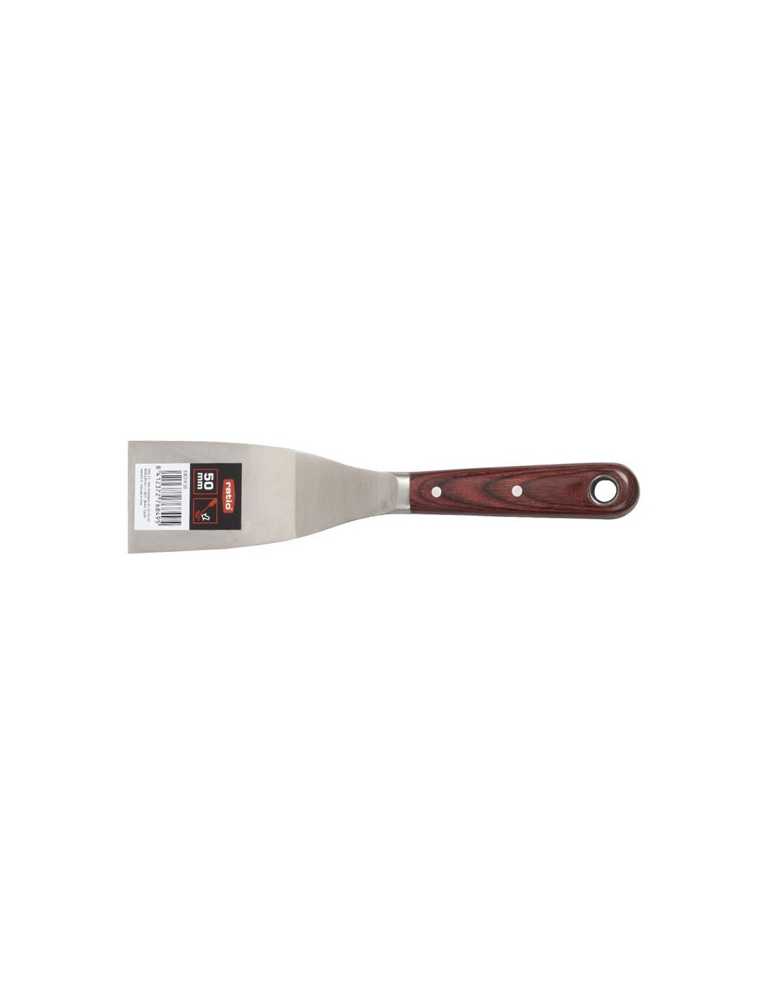 Espátula pintor RATIO acero inox. Hoja en acero inoxidable flexible y pasante hasta el mango. Mango madera de 105 mm largo. Espesor hoja: 1,5 ~ 0,5 mm. 50 mm.