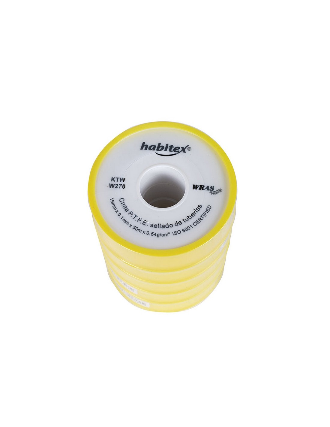 Sellador tuberías HABITEX. Cinta PTFE para sellado de tuberías roscadas. 19 mm x 50 m. Se presenta en un envase de 5 unidades.
