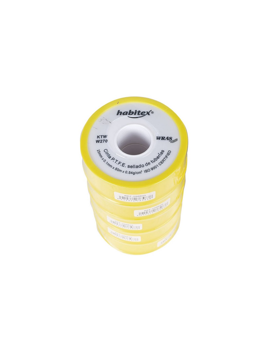 Sellador tuberías HABITEX. Cinta PTFE para sellado de tuberías roscadas. 25 mm x 50 m. Se presenta en un envase de 5 unidades.
