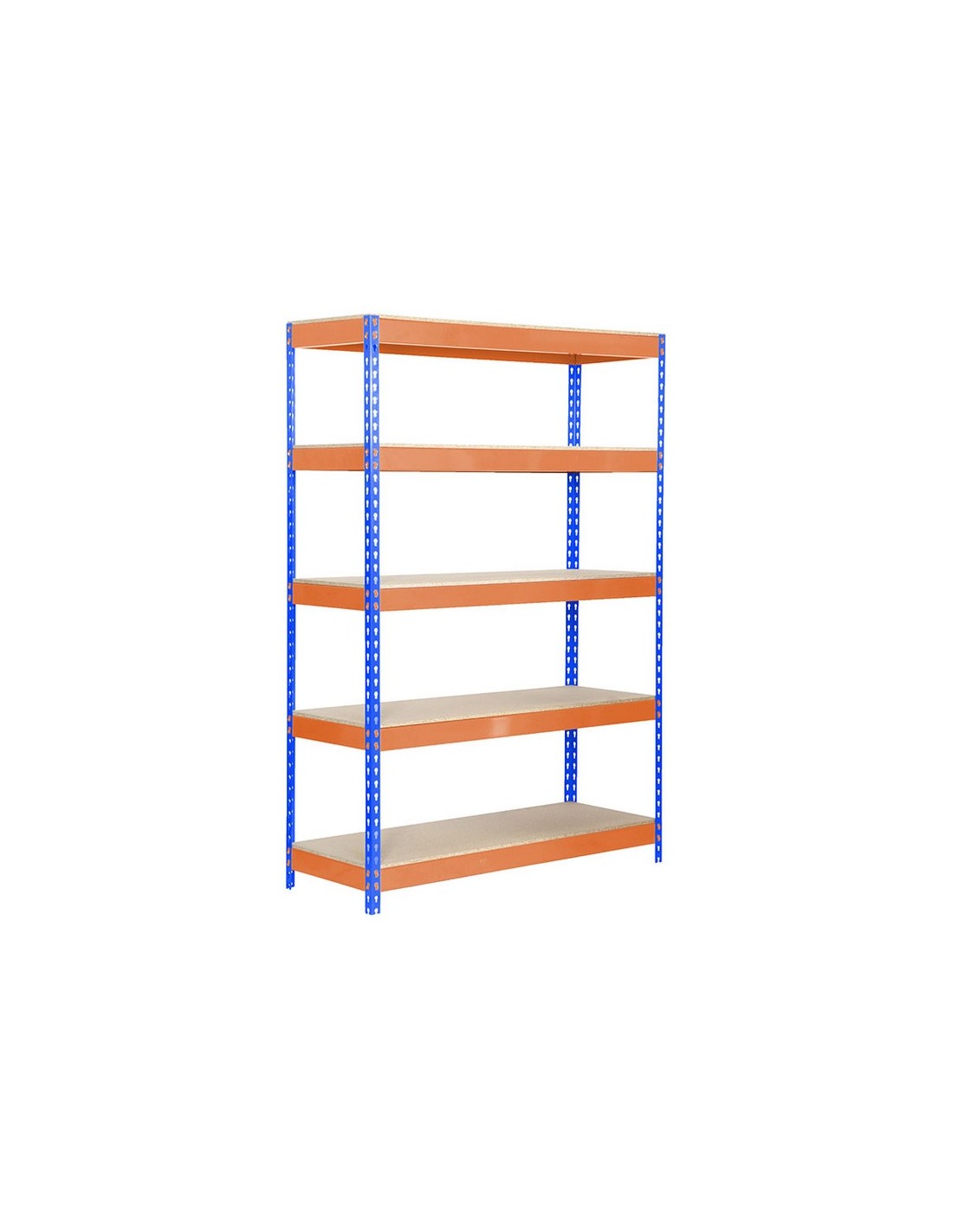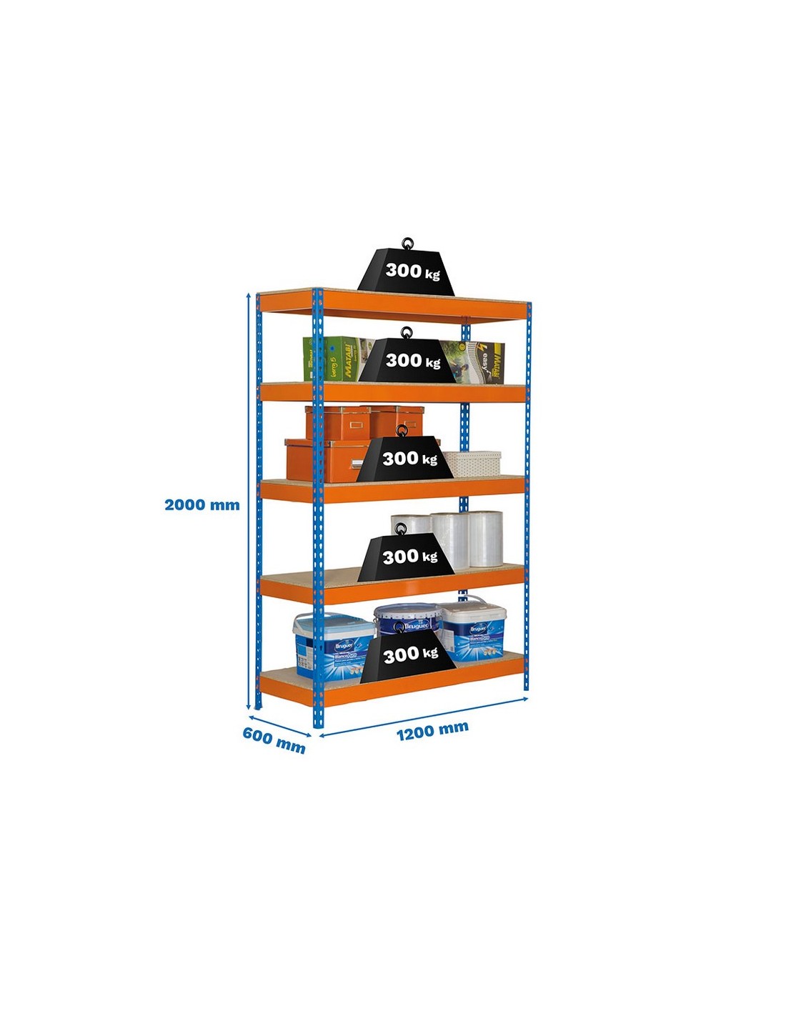 Estantería SIMÓN RACK Bricoforte 5/400 5 estantes. Montaje sin tornillos. Incluye bandejas de madera aglomerada 12 mm de grosor.. Montaje rápido. Capacidad de carga: 300kg/ estante. 2.000x1.200x600 mm. Azul/ naranja.