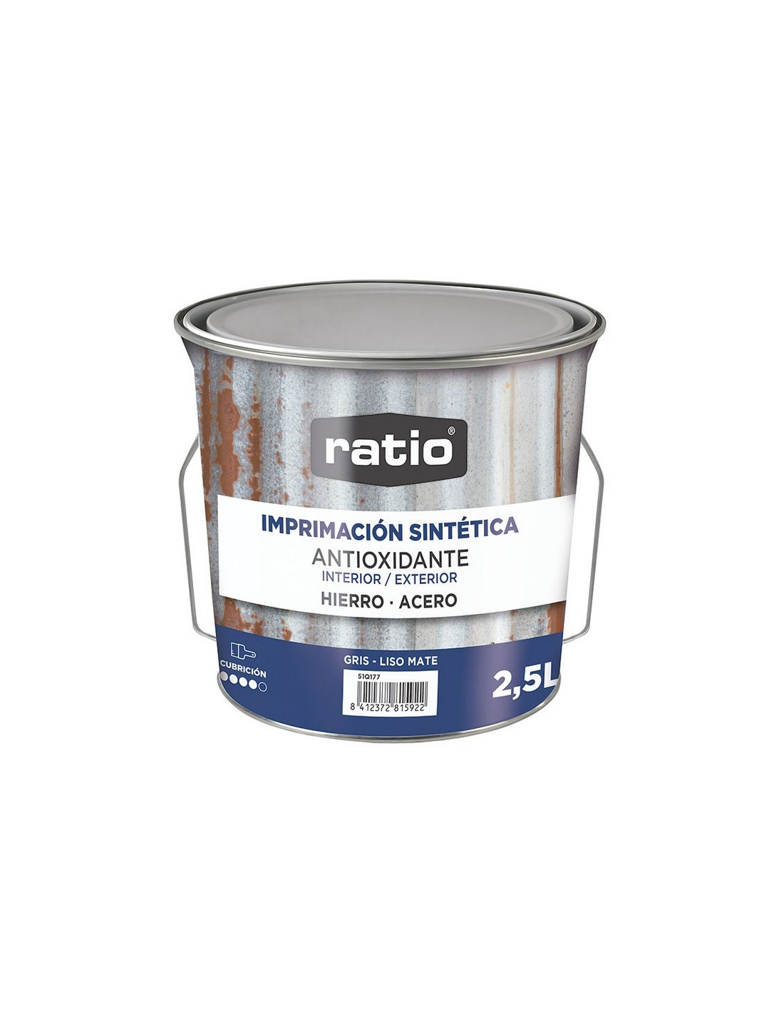 Imprimación sintética antioxidante RATIO Formulado con resinas alquídicas y pigmentos anticorrosivos. Gran resistencia a la intemperie. Recomendado para verjas, farolas y otras superficies de hierro, de aplicación directa, ya sean nuevas u oxidadas. Gris. 2,5 l.