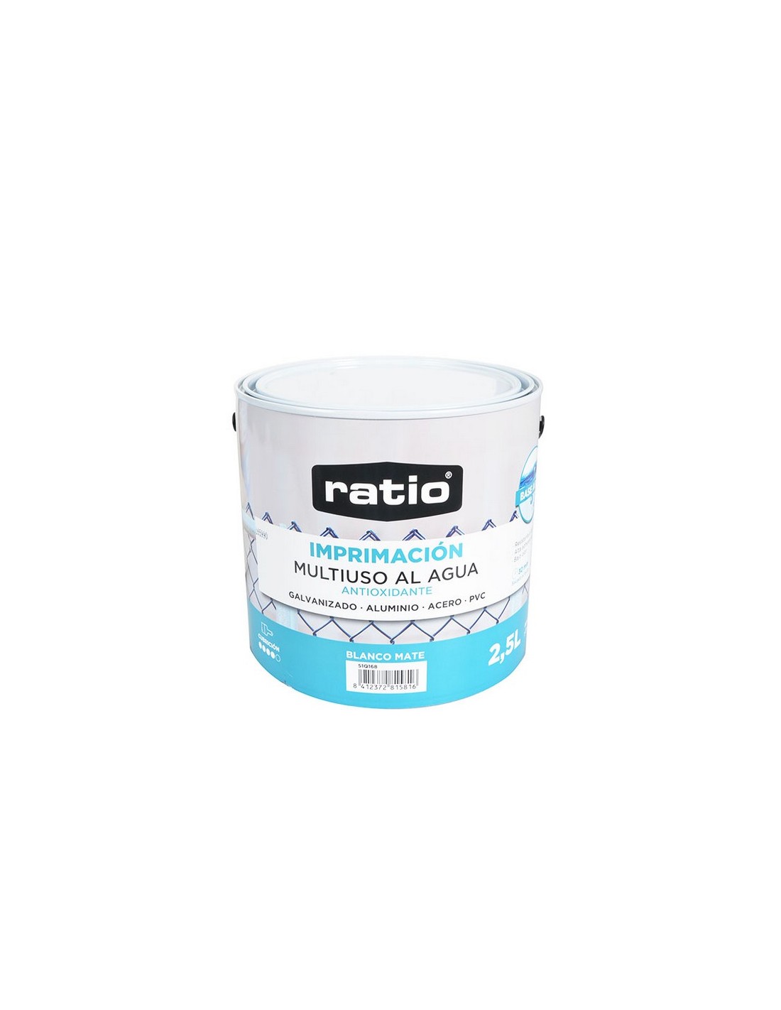 Imprimación multiusos al agua antioxidante RATIO Base agua. Recomendado para superficies de madera y hierro en interiores y exteriores. Muy lavable, resistente a los roces, buen poder de cubrición, bajo olor, no amarillea. Rendimiento: 11-12 m²/L y mano. 2,5 l. Blanco.