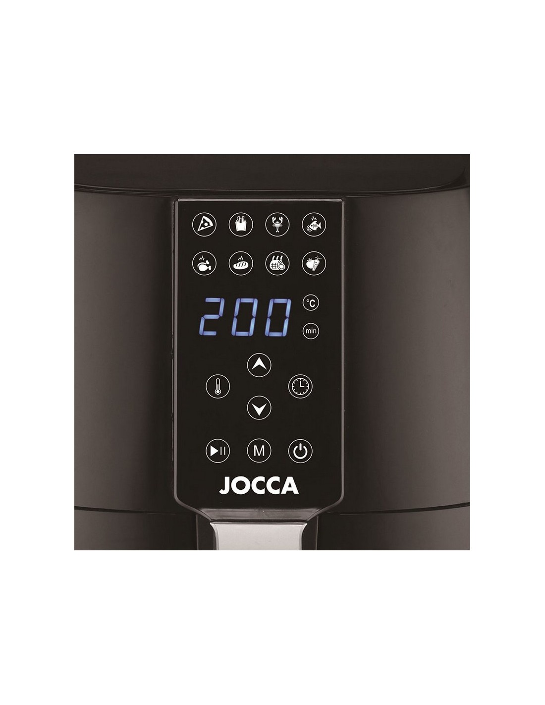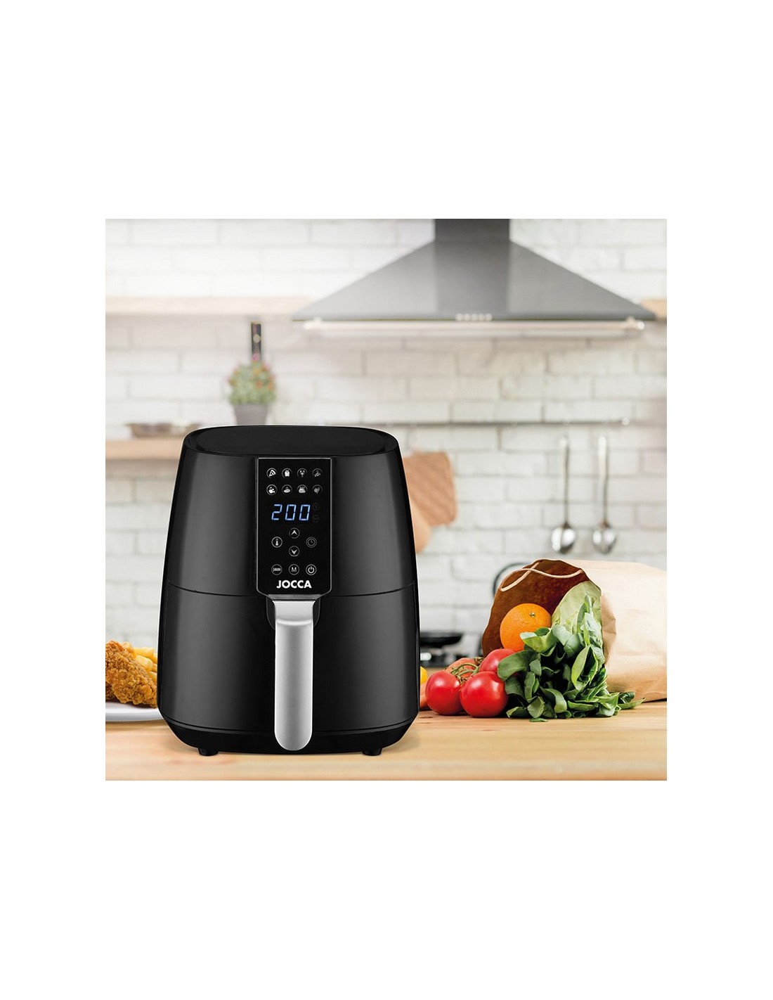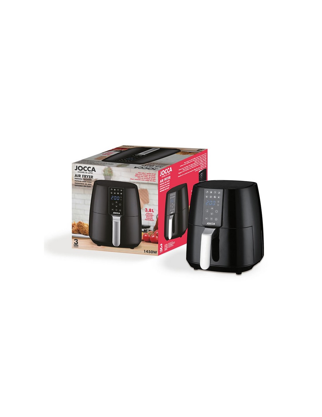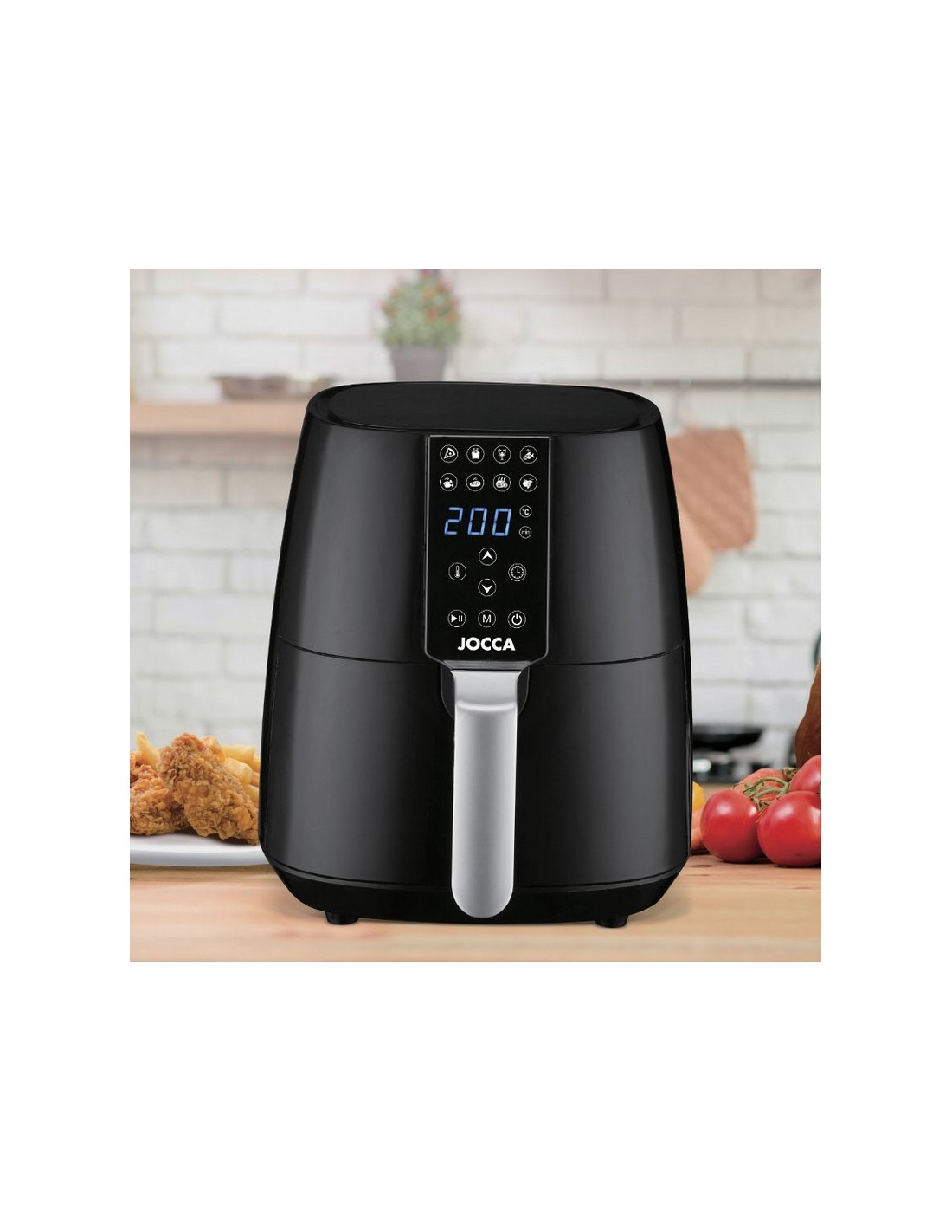 Freidora de aire caliente JOCCA Air Fryer 1507 Temporizador 30 minutos. Temperatura ajustable 80-200 ºC. Sistema circulación aire caliente cocina más sano, solo con una cuchara de aceite. Gran capacidad cesta 3,8 l. antiadherente. Bandeja y rejilla recoge-gotas extraíble. 8 programas predefinidos. Protección sobrecalentamiento. Patas antideslizantes. Mango tacto frío. 1.450 W.