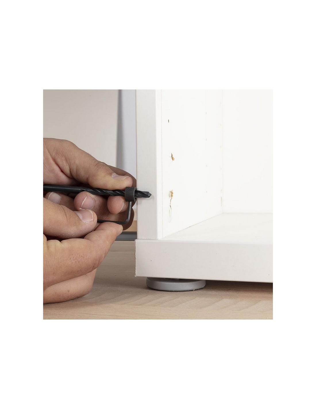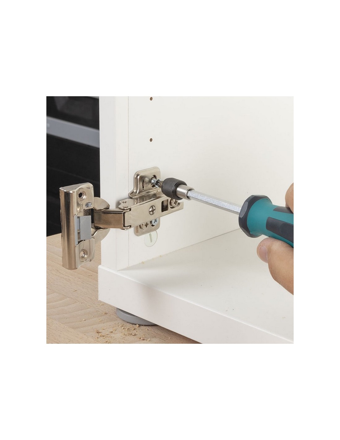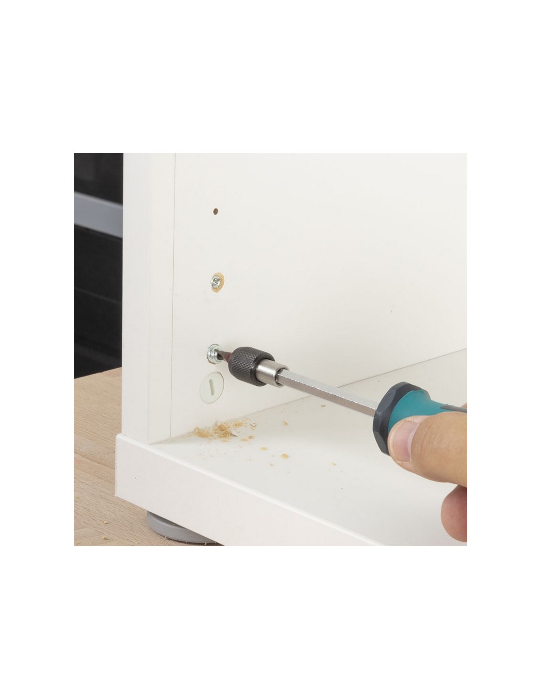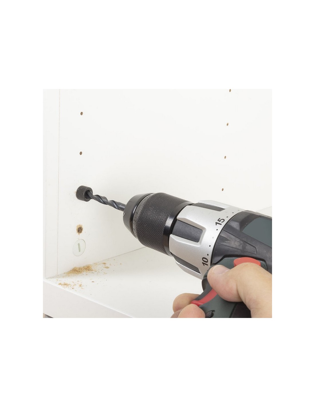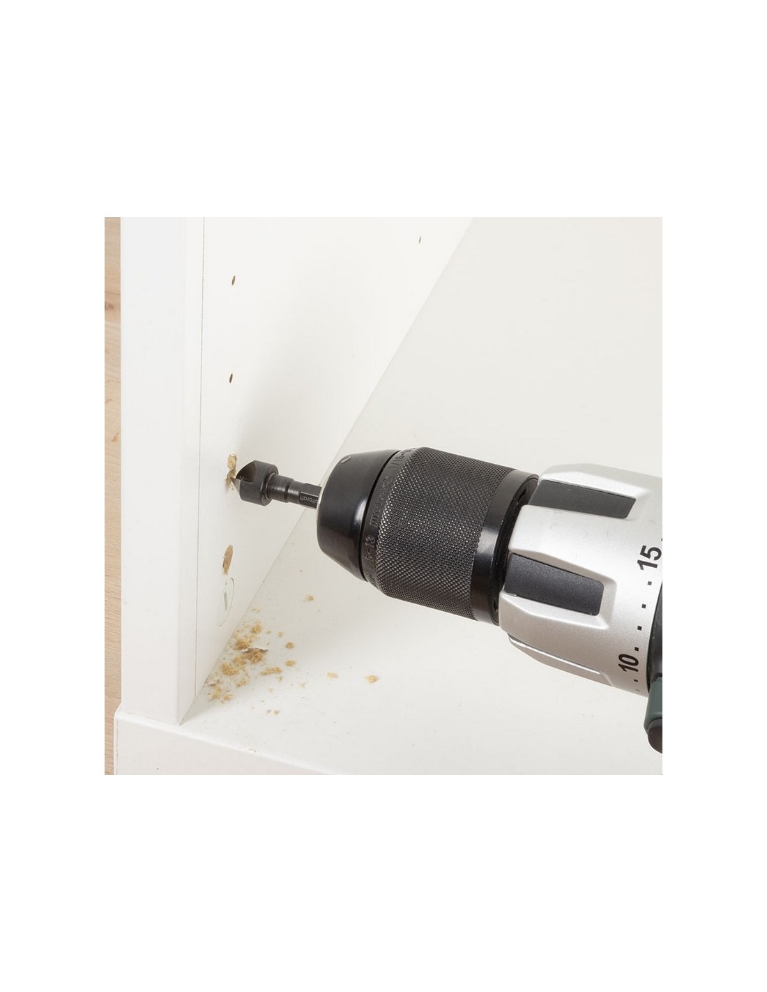 Juego de reparación bisagras WOLFCRAFT 11 piezas 1 broca de HSS de forja por laminación, ø 6 mm. 1 tope de profundidad. 1 avellanador. 4 tuercas roscadas. 4 tornillos de cabeza avellanada. Cuerpo mueble. 11 piezas.