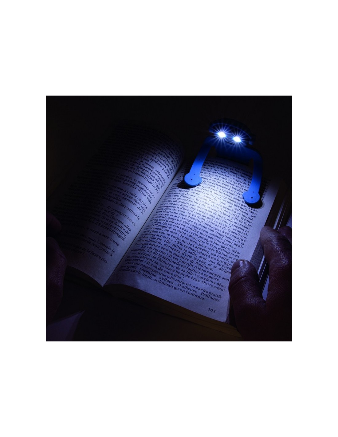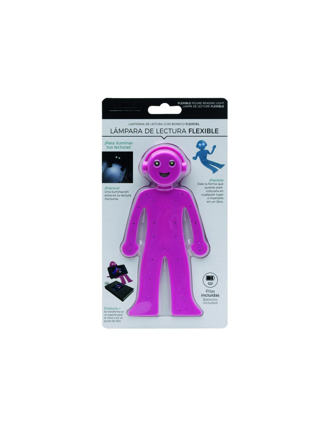 Lámpara flexible de lectura CMP 16 cm Útil como marca página y como soporte para móvil. Azul y fucsia.