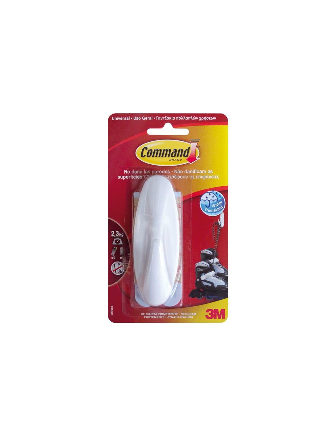 Colgador adhesivo 3M serie Command. Cintas resistentes al agua. Sin necesidad de hacer agujeros. Se adhiere a multitud de superficies; paredes pintadas. madera, baldosas.... Se retiran limpiamente, sin marcas, sin residuos pegajosos, ni manchas. Reutiliza los ganchos usando las tiras d 1 gancho grande ovalado + 2 tiras. Soporta 2.3 kg. Blanco.