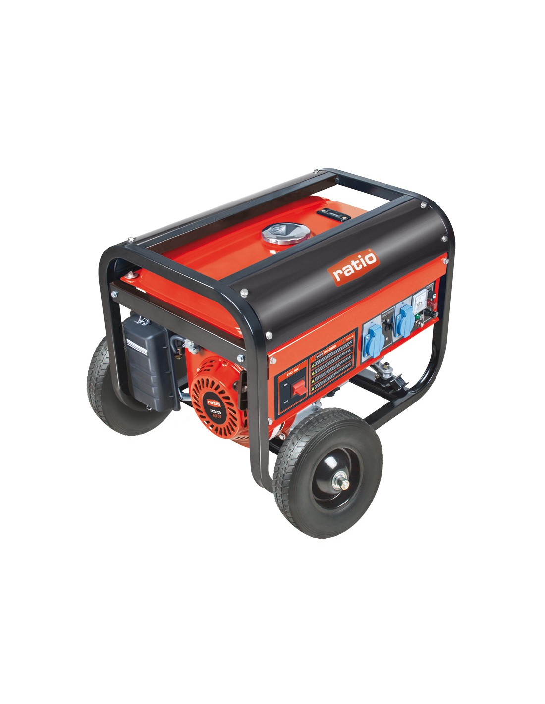 Generador RATIO RG-3600. Motor 4 tiempos. 196 cm³. 6,5 Hp. Monofásico 220V. AVR + voltímetro. Chasis fijo con ruedas de transporte. Tomas Schuko: 2 salidas. Autonomía aprox. 8 h. Potencia máx: 2.8 Kva.