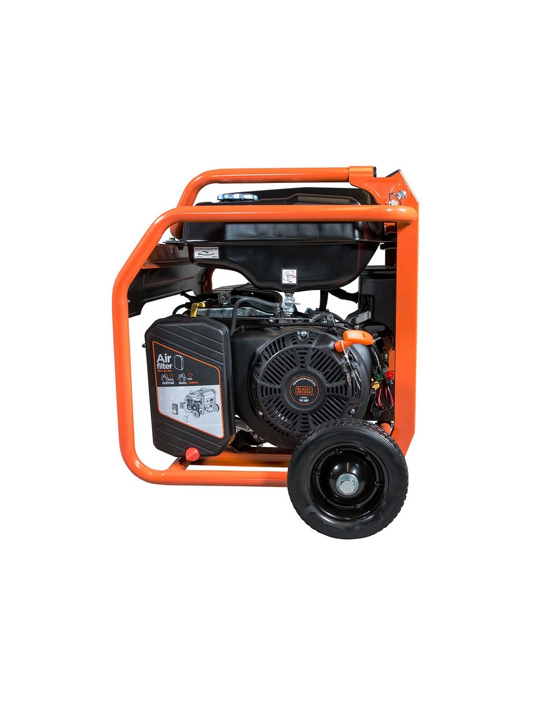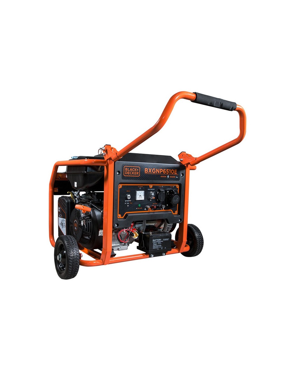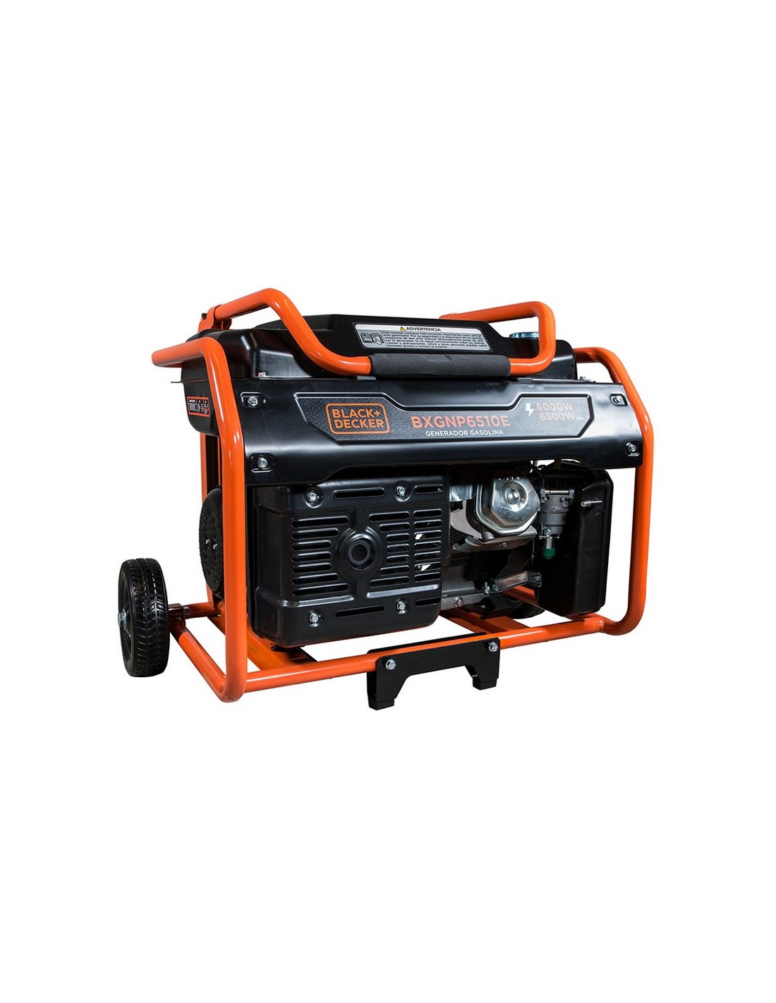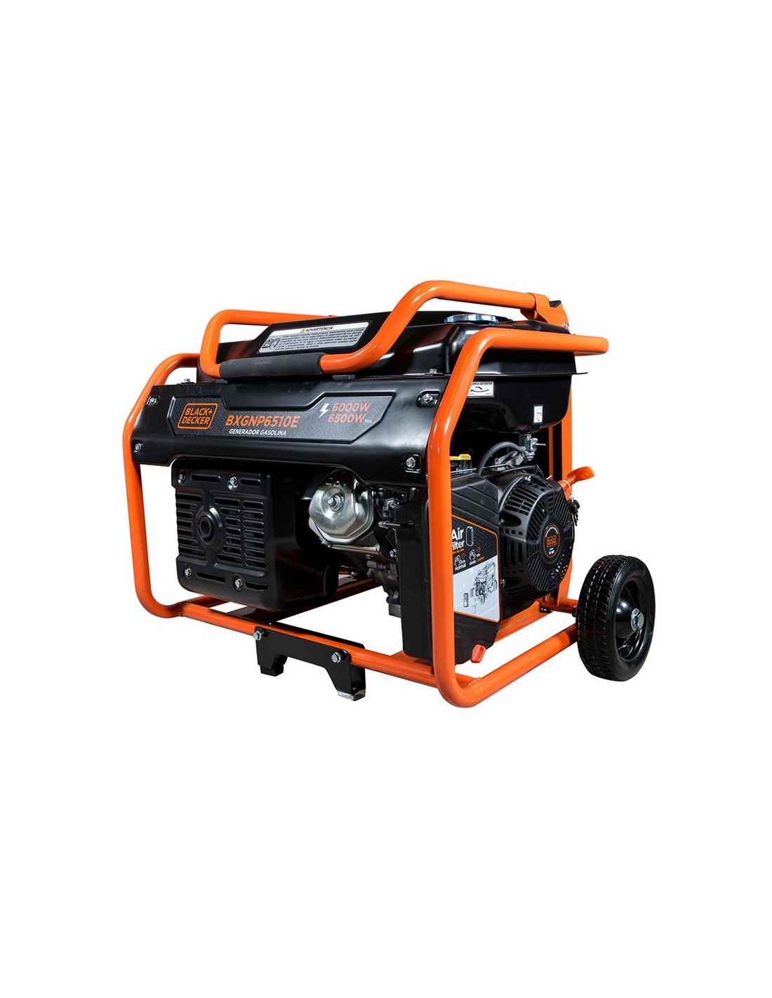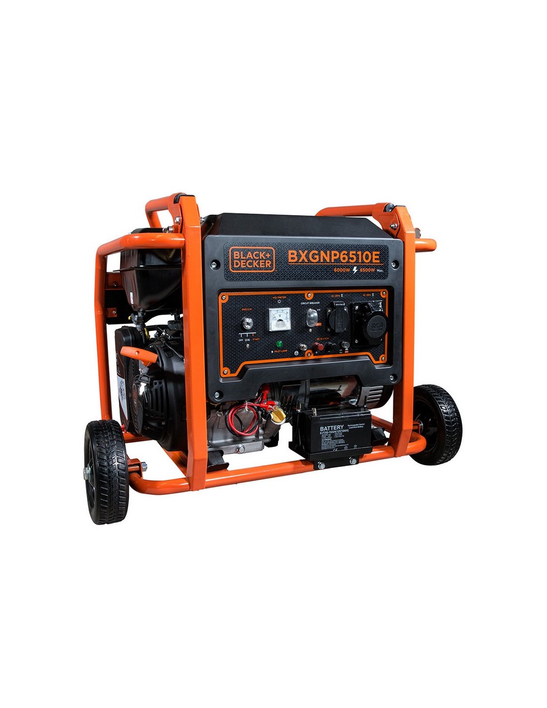 Generador gasolina B&D BXGNP6510E electric start+ruedas +enchufes. Potencia nominal 6.0. Potencia máx. 6.5 kW. Intensidad. 28,2 A. Salidas: 1x32A + 1x 16A. Salida DC 12V. Motor AVR 15Hp. Depósito 33 littros 50x575xh.620 mm. 6.0/6.5 Kw