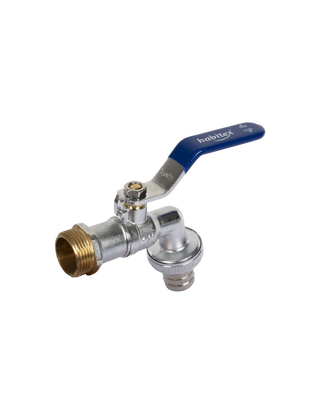 Grifo curvo esfera HABITEX Racor manguera. Palanca de acero cromado. Cuerpo de latón niquel-plateado. Junta cierre PTFE. Conexión manguera de latón CW617N níquel-plateado. Uso en agua fría y agua caliente. 3/4x1\".