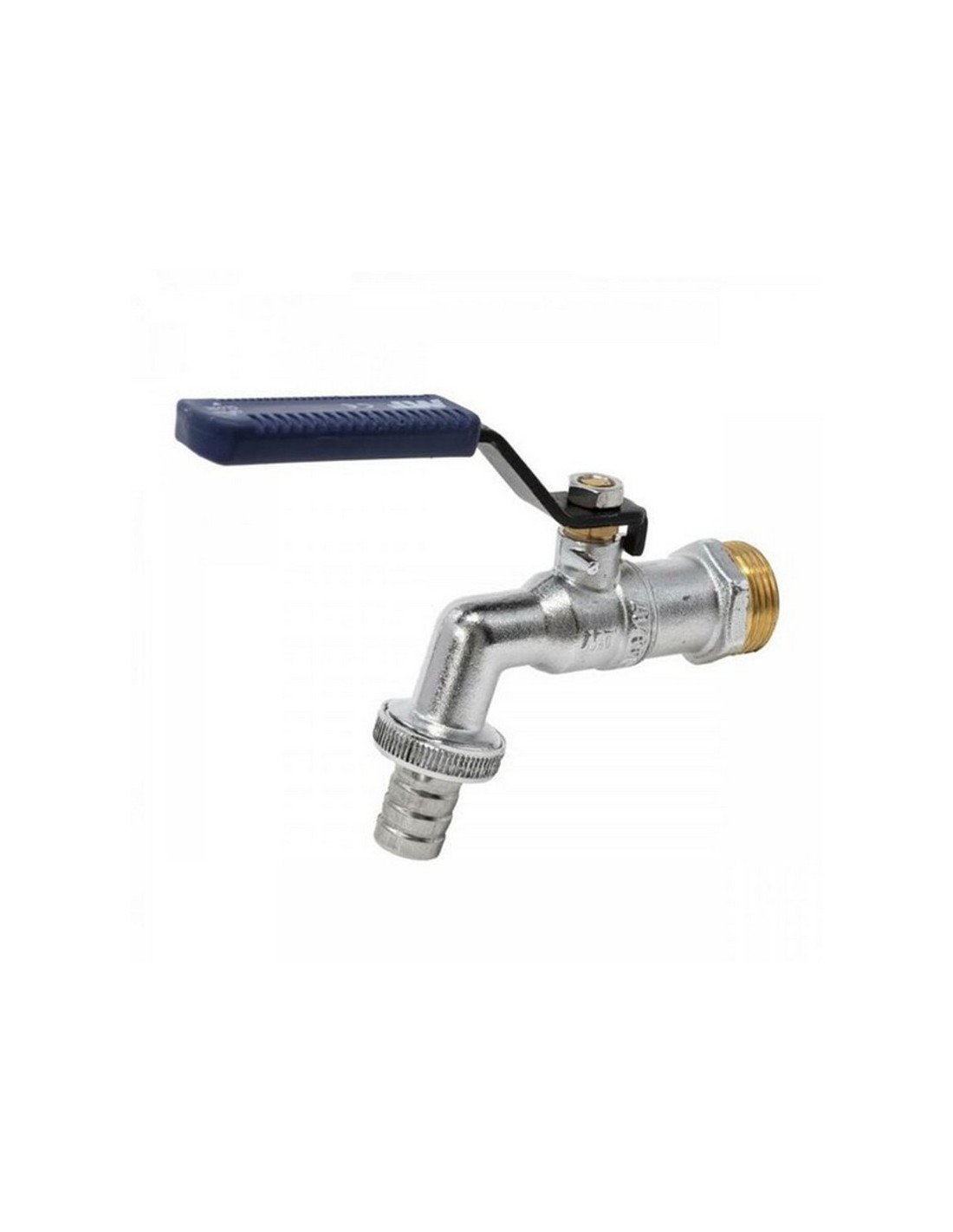 Grifo esfera jardín MT palanca cromada PN-16 Maneta ergonómica acero al carbono con recubrimiento de alta resistencia anticorrosión color azul. Conexión manguera. Cierre rápido (1/4 vuelta). Latón CW617N. 1/2\"x3/4\".