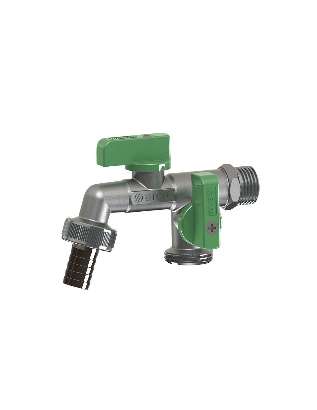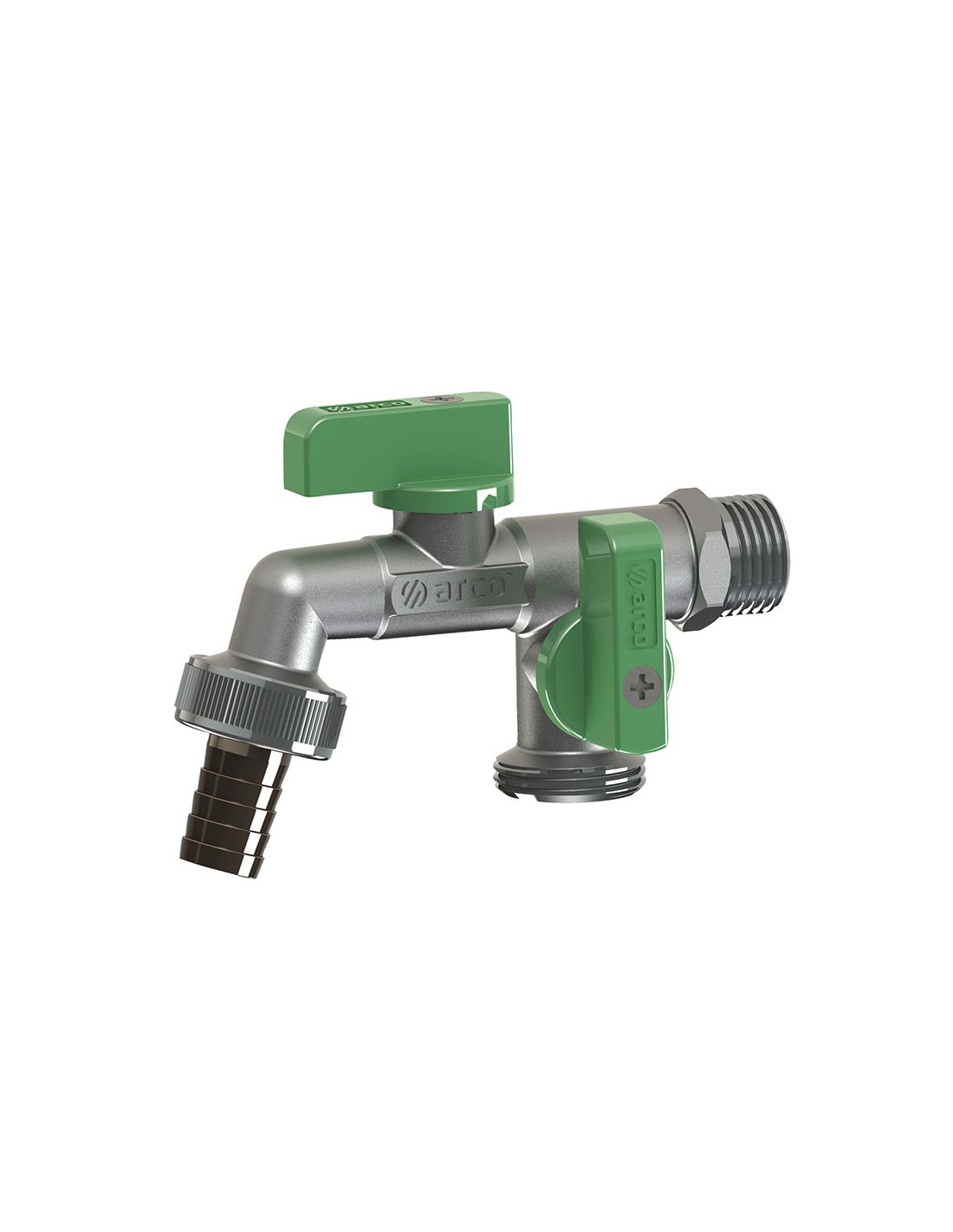 Grifo curvo esfera antical doble ARCO Mac Nano. Vitaq System. PN16. Un solo cuerpo. Acabado cromo. Sistemas de apertura y cierre 1/4 de vuelta. Boquilla metálica. Fabricado con latón europeo EN12164 y EN12165.. M1/2\" x M3/4\" x M3/4\" x ø 15 mm.