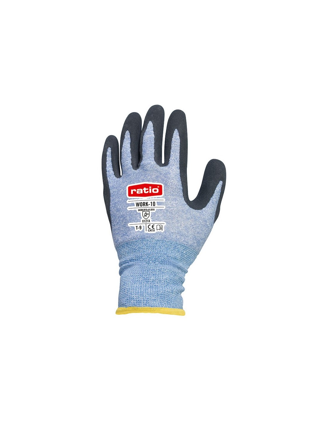 Guante RATIO Work-10 Poliéster reciclado con spandex recubierto de látex arenoso en la palma. Uso: Tareas general, manipulaciones sin riesgo de corte que requieran tacto, cadenas de montaje, automoción, logística y almacén, instalaciones, mantenimiento ligero. Cat. II EN 388. Talla 8.