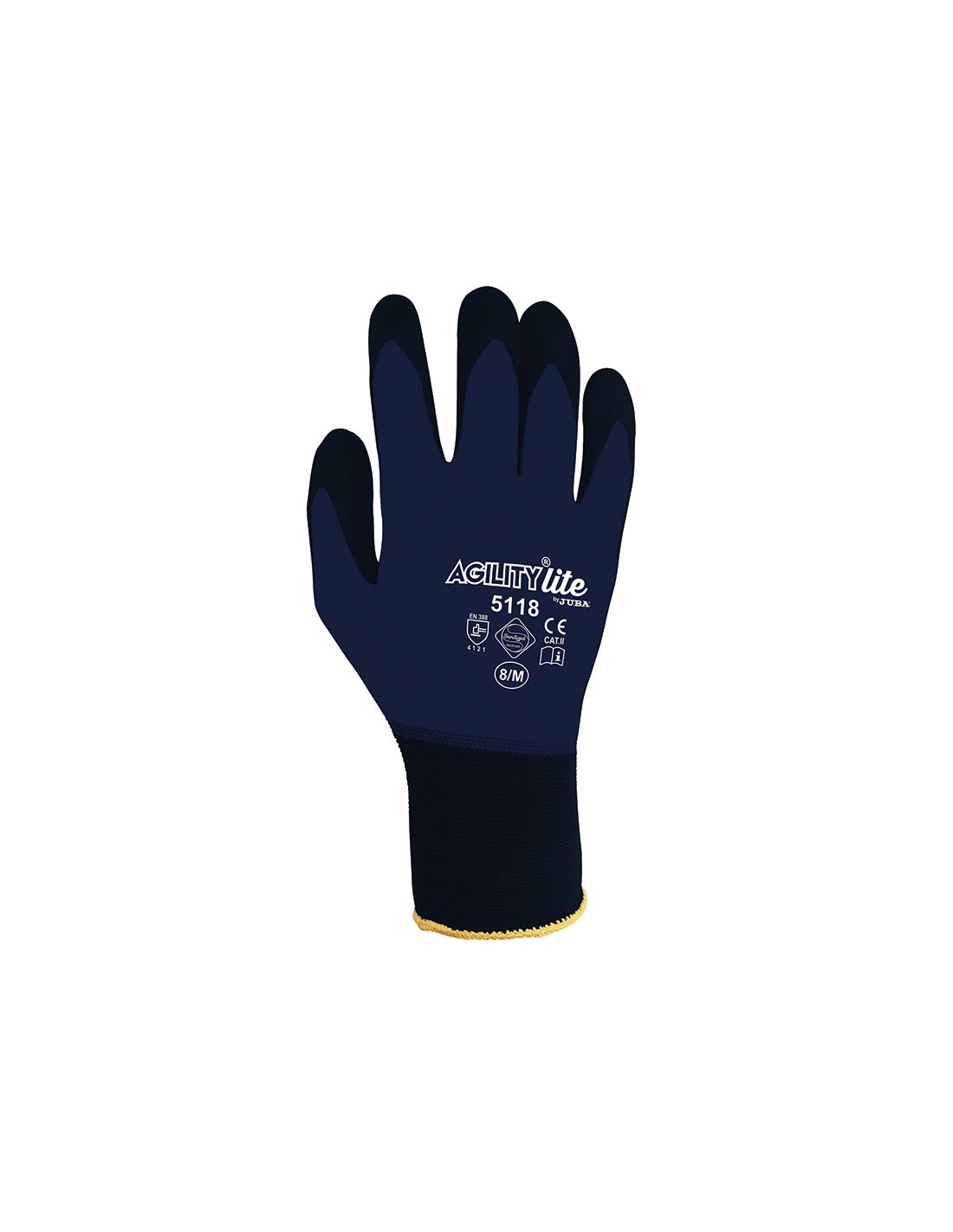 Guante JUBA Agility Lite H-5118. Nilón + elastano (spandex) sin costuras con recubrimiento de nitrilo foam NFT. Uso: automoción, inspección de calidad, montaje preciso, mantenimiento, talleres mecánicos. Cat. II. EN-420, EN 388. Talla 8.