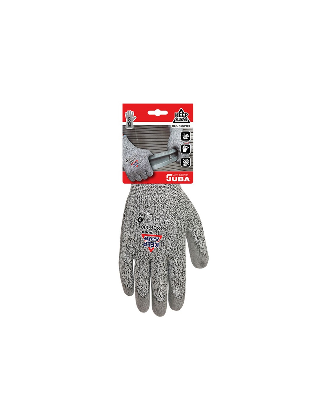 Guante JUBA Keep Safe HKSCP300 Fibra anti-corte HDPE + PU en palma, sin costuras y con elastano. Usos: manipulación de materiales abrasivos y cortantes, industria del automóvil, inyección y moldeado de plásticos, industria del vidrio, etc. Talla 8.