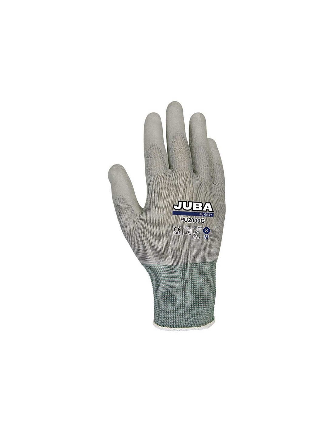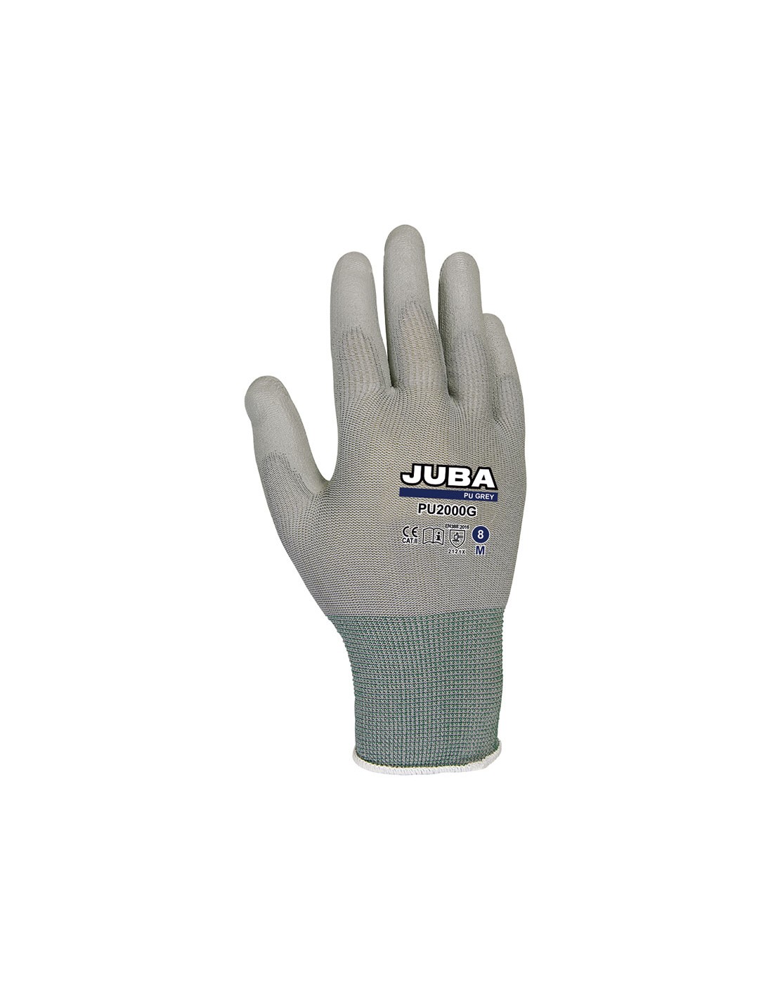 Guante JUBA PU-2000G. Nilón con recubrimiento poliuretano gris. Excelente sensación al tacto, flexible y confortable. Buena resistencia a la abrasión. Usos: montaje y desmontaje de carrocerías, transformación de metales, industria electrónica. Cat. II. Talla 8.