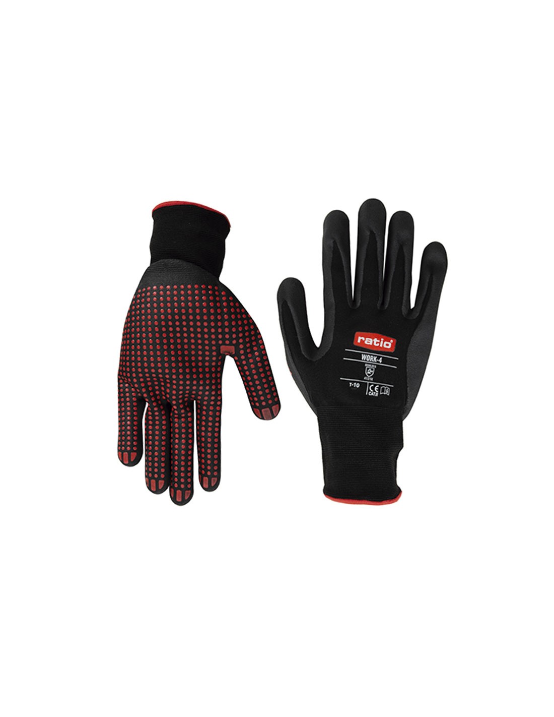 Guante nilón RATIO Work-4 Recubrimiento nitrilo. Resistente a aceites. Usos en agricultura, automoción, construcción mecánica y montaje. Tallas: 7-8-9-10. Talla 8.