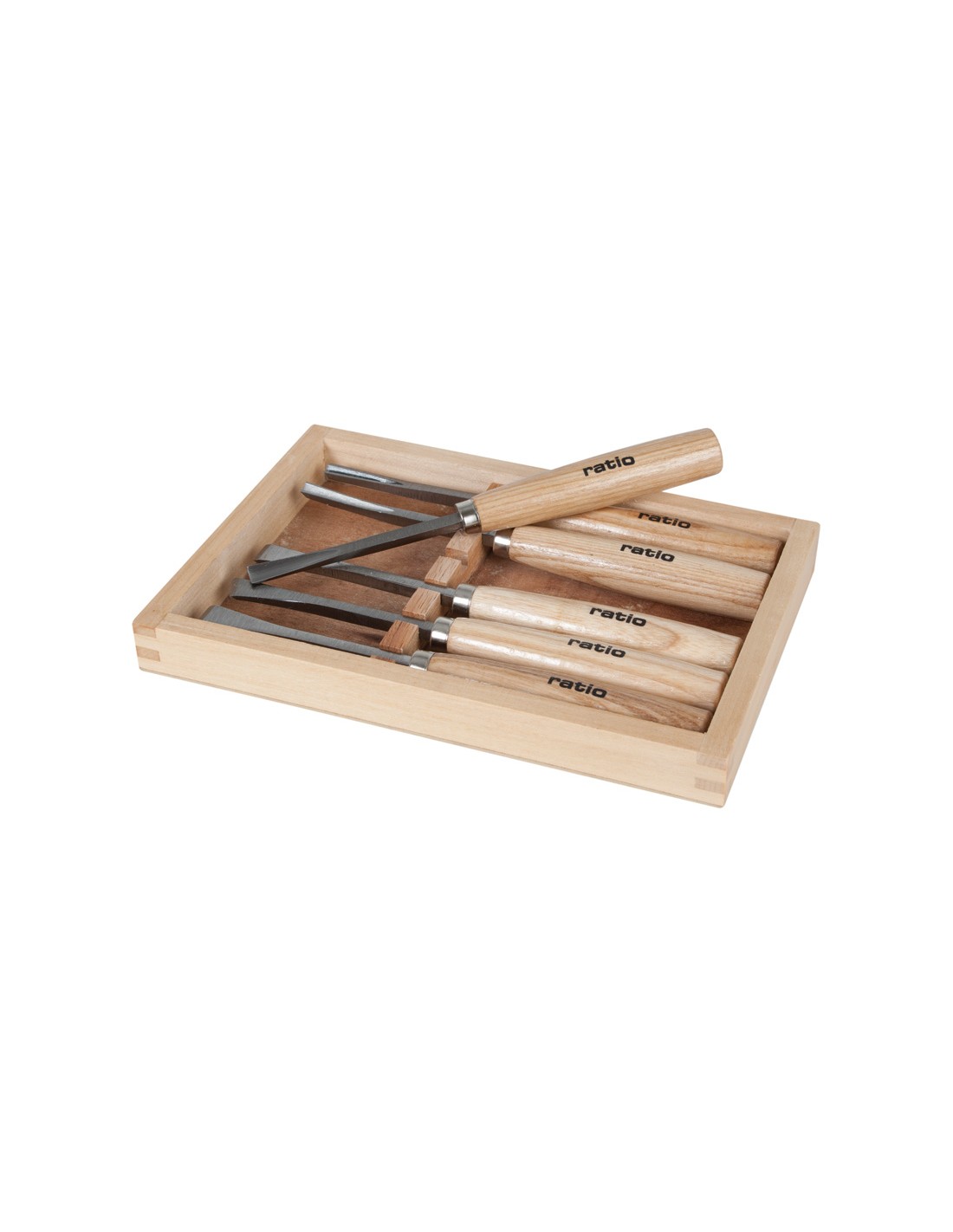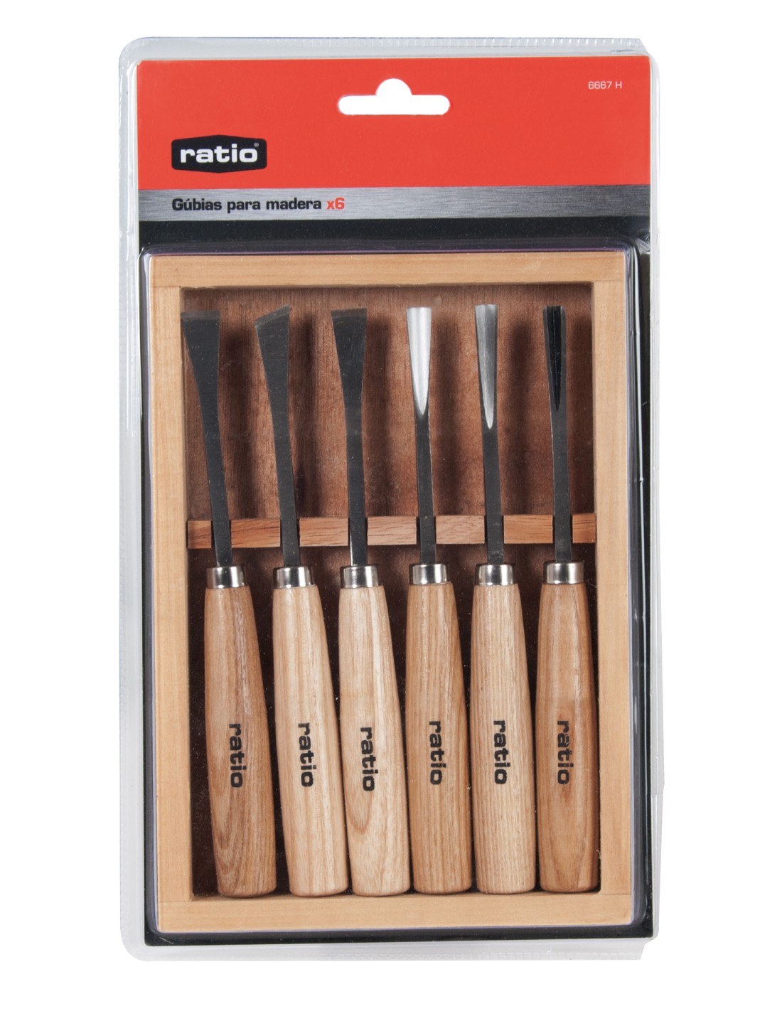 Gubia carpintero RATIO 6 piezas. Mango haya barnizado. Cuchillas acero carbón #45. Presentación en caja soporte de madera. Composición: