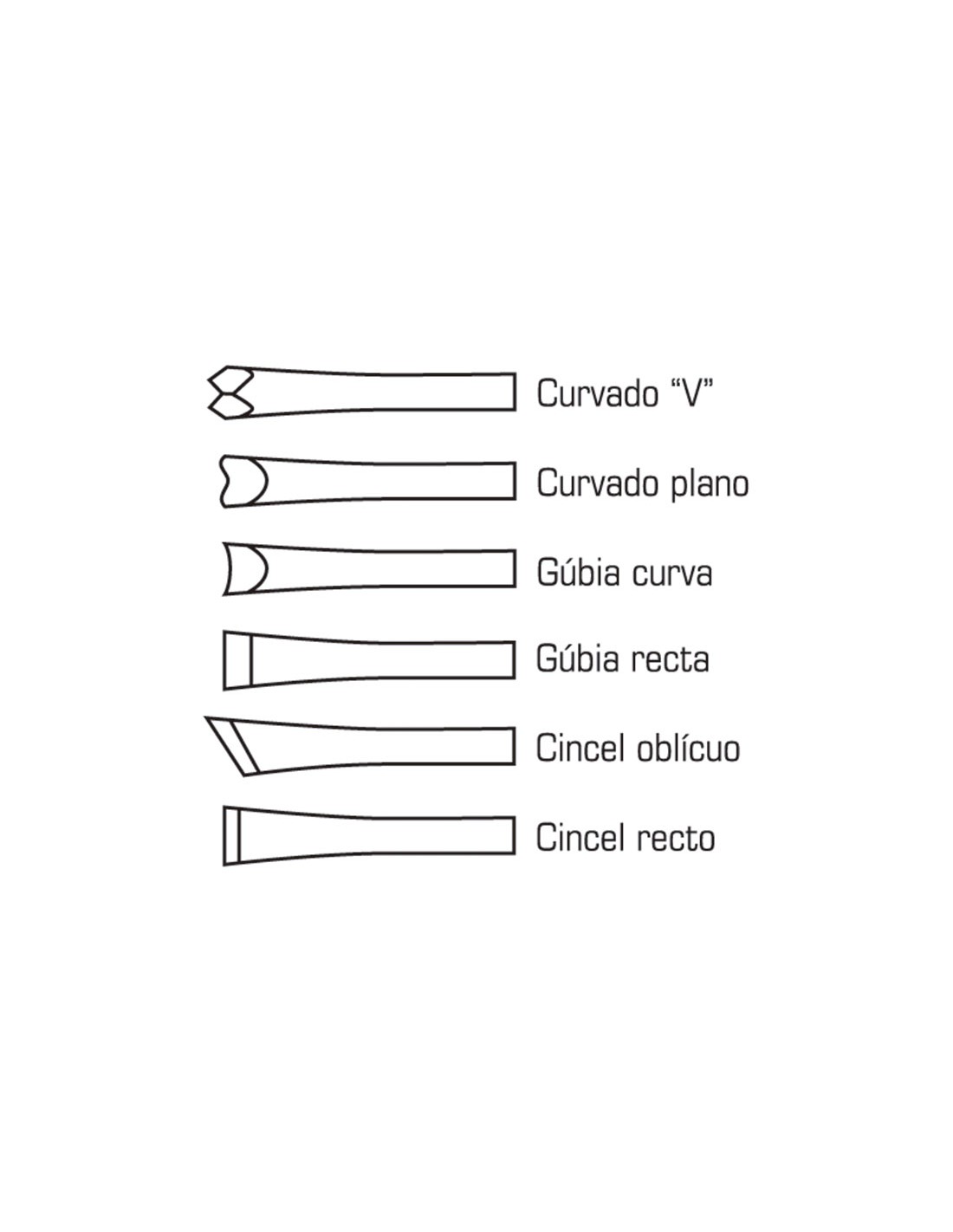 Curvado V / Curvado plano / Gubia curva / Gubia recta / Cincel oblícuo / Cincel recto.