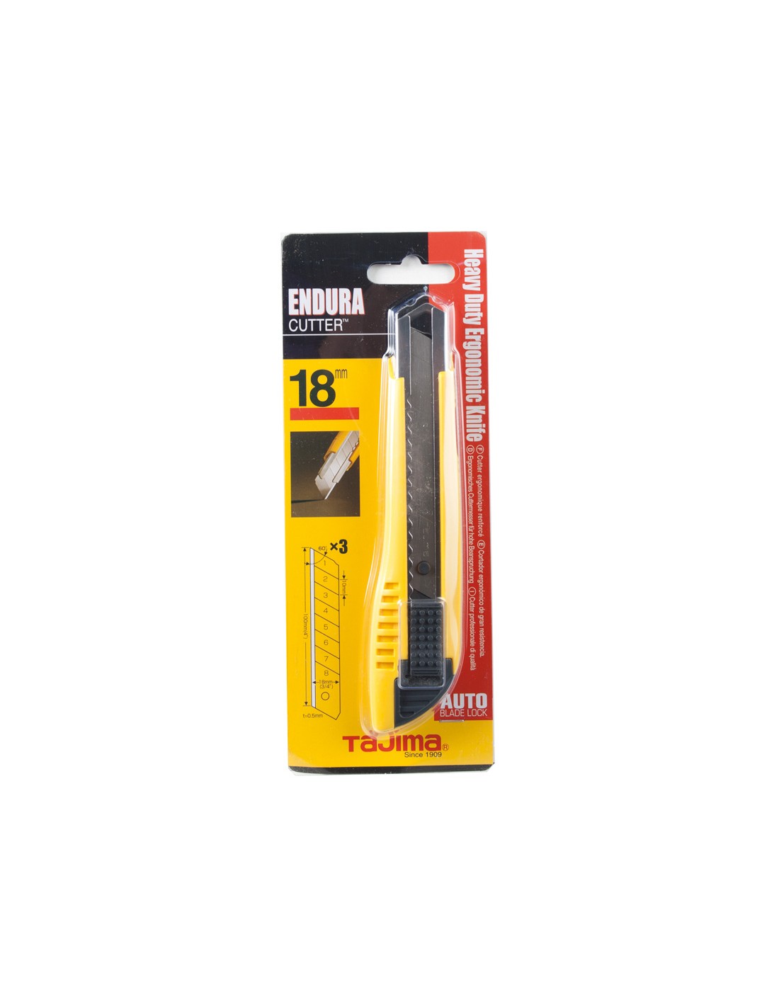 Cortador TAJIMA LC-500. Trabajos duros. Mango acero inox con protección ABS. Incluye 2 cuchillas de recambio. Ancho cuchilla 18 mm. LC-500. Bloqueo automático.