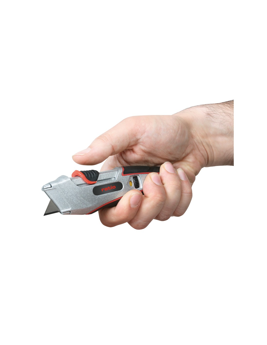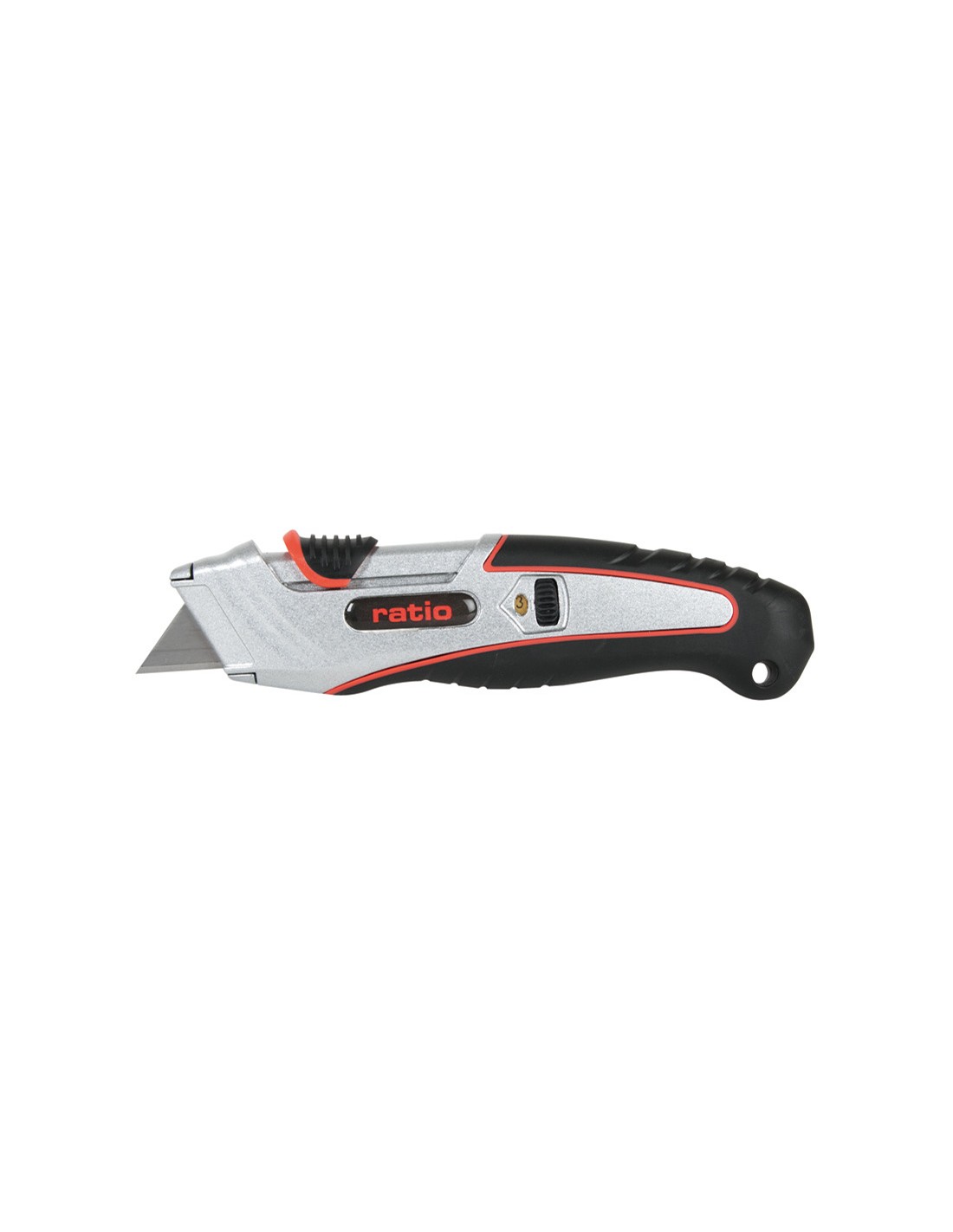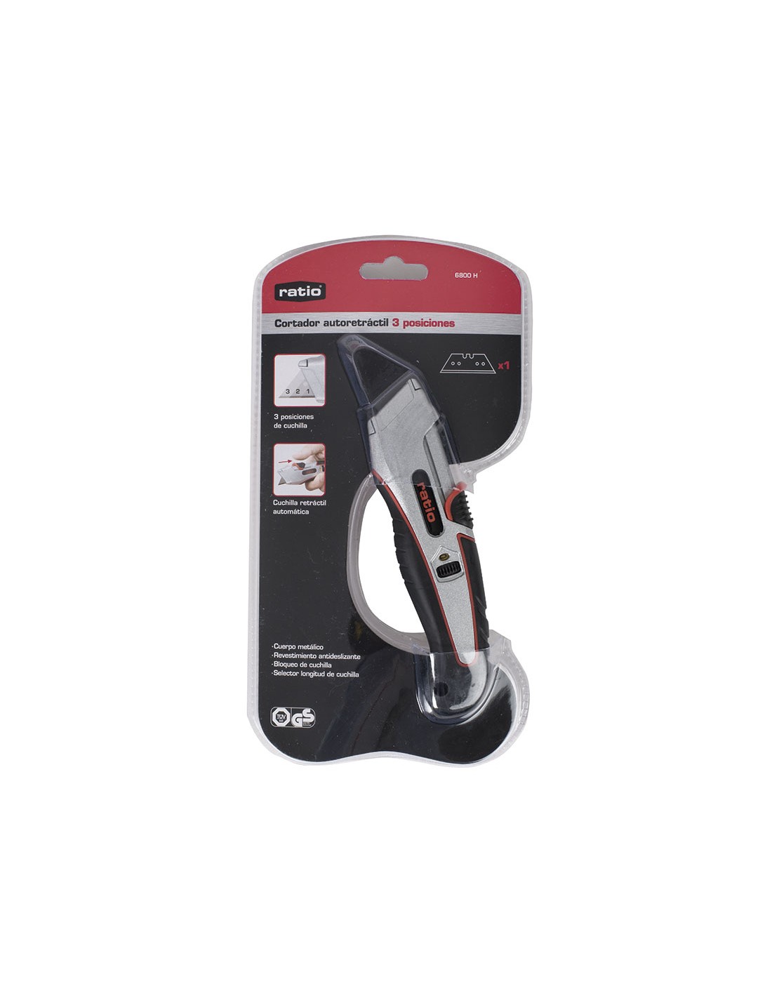 Cortador hoja retráctil automática RATIO 6800 3 posiciones de cuchilla. Cuerpo metálico con revestimiento antideslizante. Incluye 1 cuchilla trapezoidal. Homologado TÜV/GS. 157 mm.