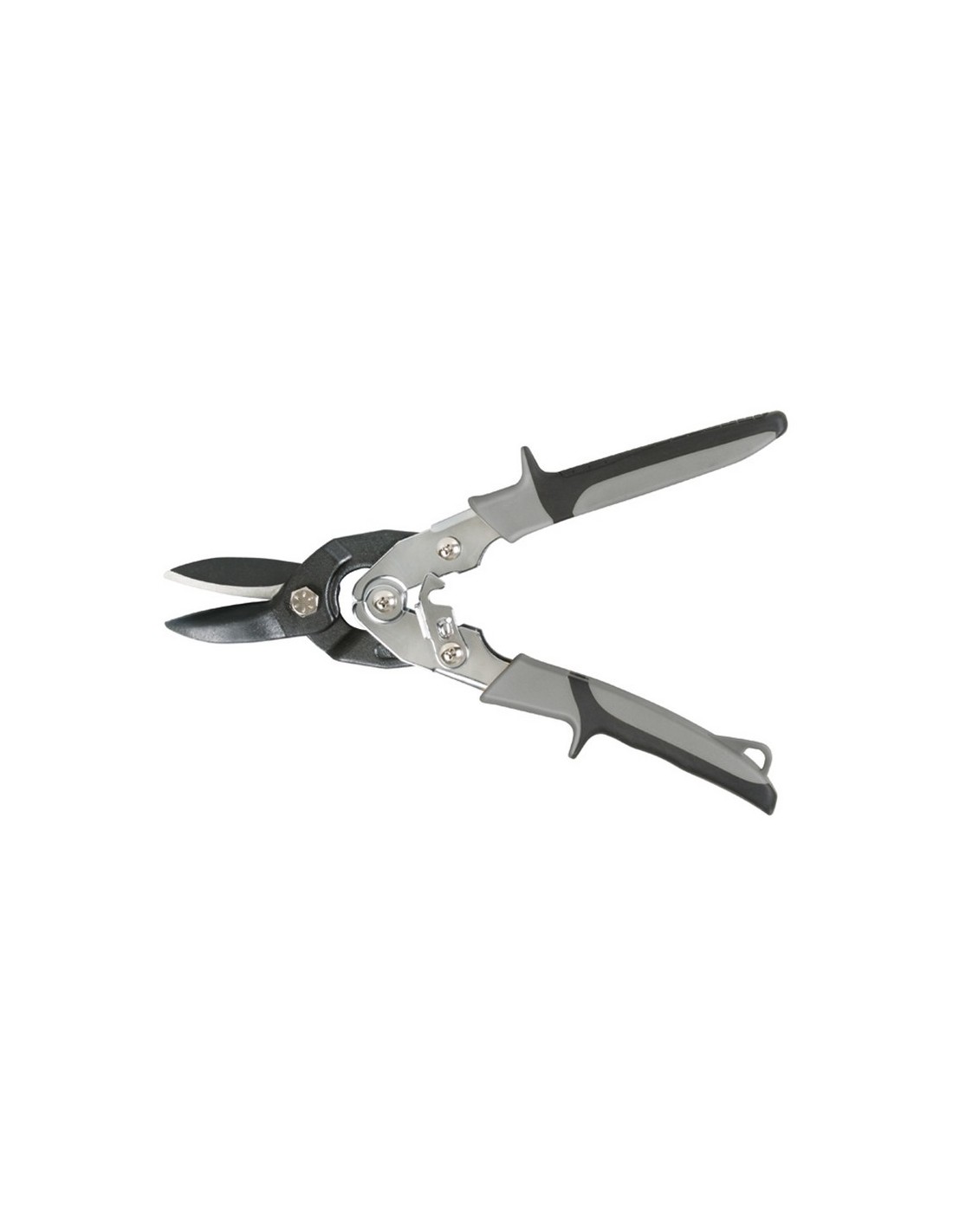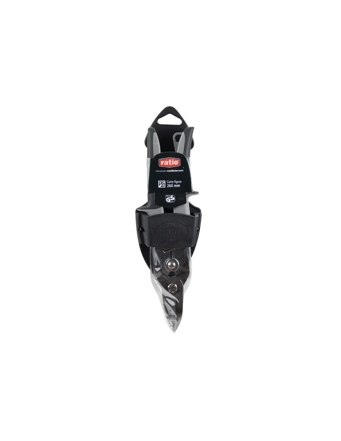 Tijera cortachapa RATIO 6885 Bocas forjadas acero cromo-molibdeno pavonado. Filo dentado templado dureza 60-62 HRc. Corte máx: acero laminado 1,5 mm, acero inox 0,9 mm, cobre 1,8 mm. Mango bimaterial antideslizante. Funda plástica para cinturón. Homologación TÜV/GS. 10\"-260 mm.