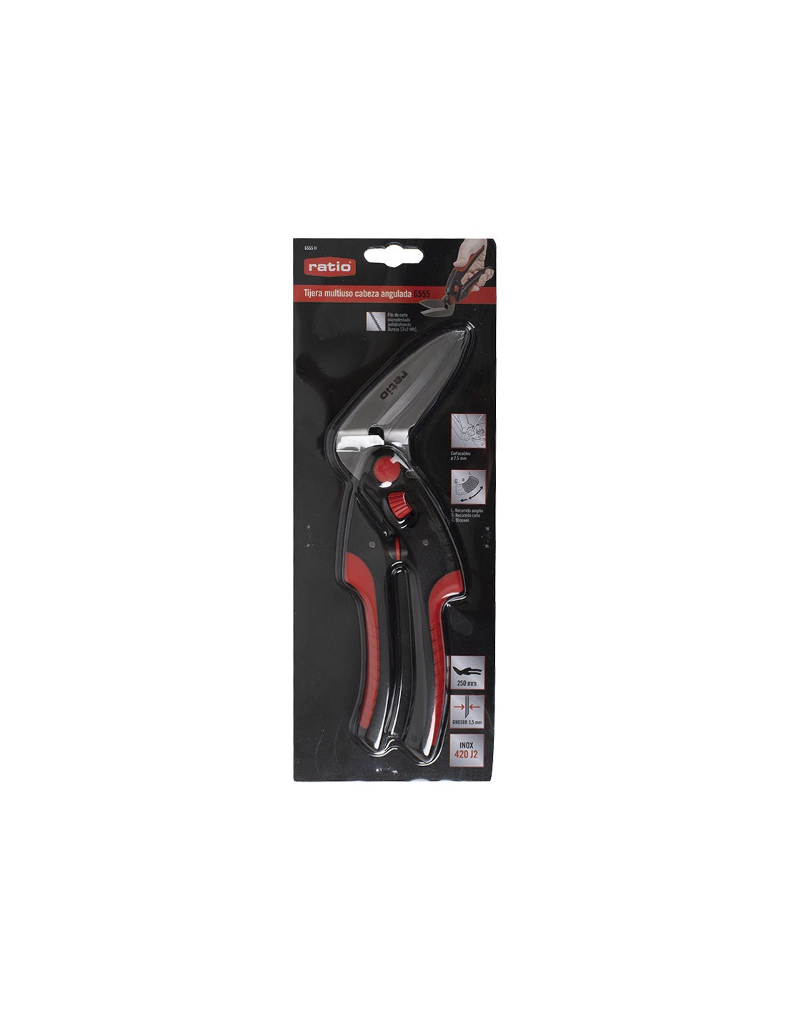 Tijera multiuso cabeza angulada RATIO 6555 Mangos bimaterial antideslizantes. Incluye selector para gran apertura "L", más reducida "S" y función cierre "C". Hojas de acero Inox 420 acabado pulido de 3,5 mm de espesor. Con filo (53±2 HRC) antideslizante gracias al microdentado. Cabeza angulada para hacer fácilmente corte largos. 250 mm.