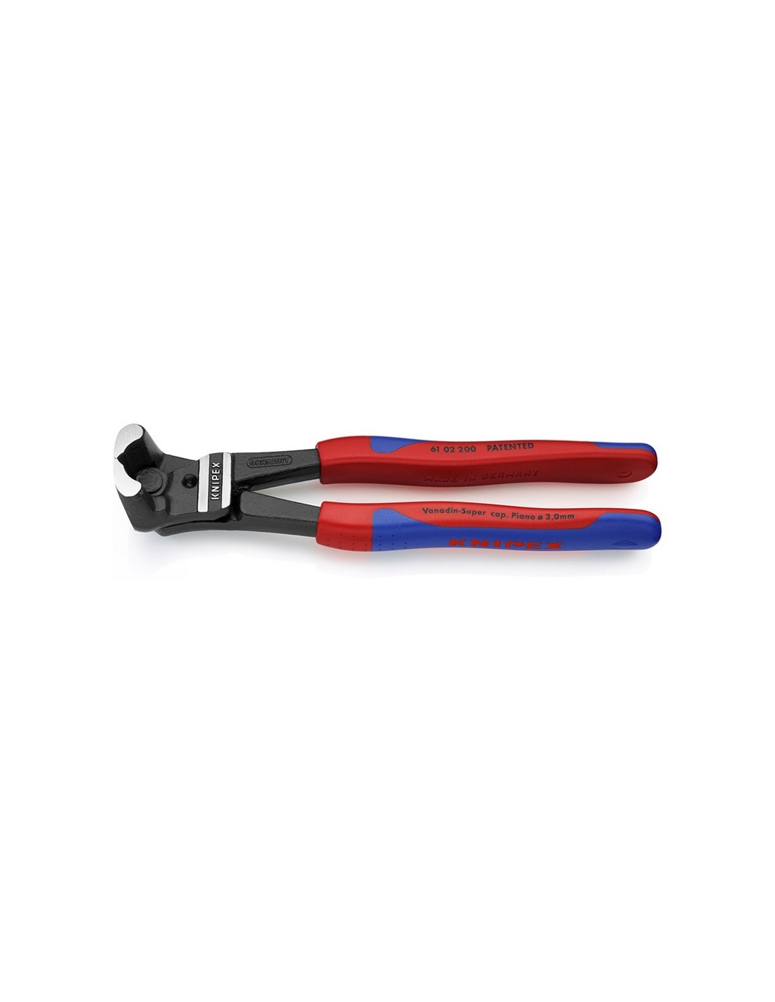 Cortavarillas corte frontal KNIPEX 61 02 200 Gran efecto palanca. Acero cromo-vanadio acabado negro atramentado. Filo con bisel. Cabeza pulida. Mangos antideslizantes bimaterial. 200 mm.