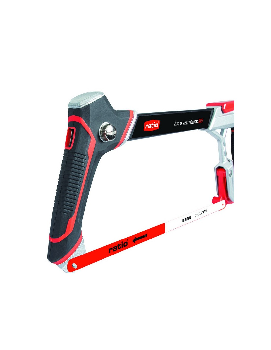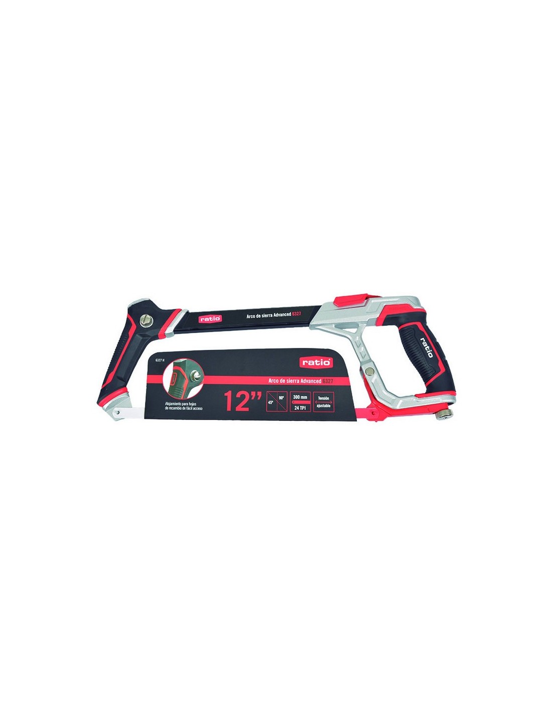 Arco sierra RATIO 6327 Advanced Mango ergonómico bimaterial antideslizante. Cambio rápido de hoja. 2 posiciones de corte 90º/45º. Incluye hoja bimetal 12"/24TPI. Tensión permanente y fácilmente ajustable. Con alojamiento para hojas de recambio de fácil acceso. 12\"- 300 mm.