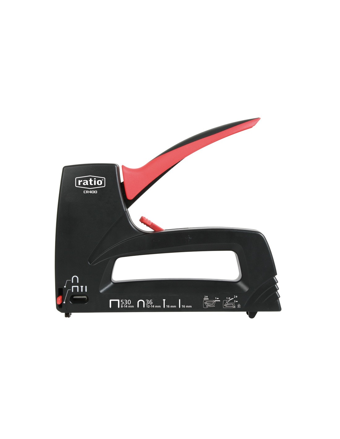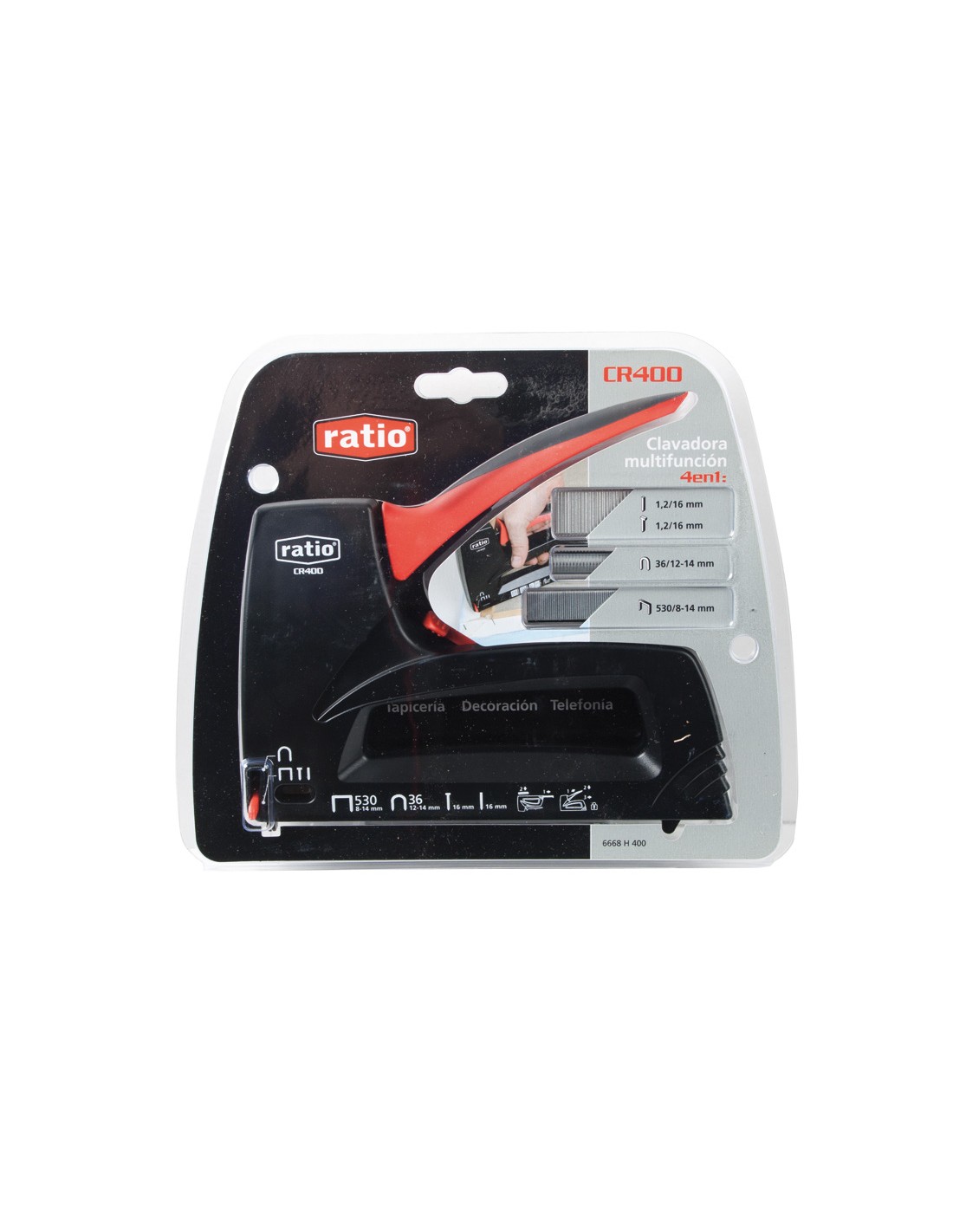 Clavadora multifunción 4 en 1 RATIO CR400. Armazón plástico alta resistencia. Regulador de potencia. Sistema de bloqueo y seguridad en maneta. Ergonómica y confortable. Incluye 200 grapas 530 (12 mm),100 grapas cable (12 mm), 100 puntas con y sin cabeza (16 mm). Grapas 530 (8-14 mm).\r\nGrapas cable 36 (12-14 mm).\r\nPunta con y sin cabeza 1,2 mm x long. máx. 16 mm.