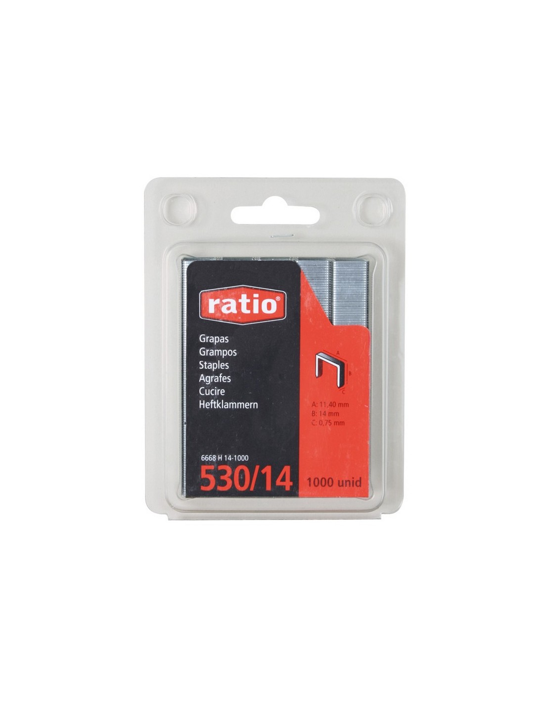 Grapas RATIO mod. 530. Clavadoras Ratio, Clavex, Rapid, Esco, Rocafix, Arrow y Novus. Blíster 1.000 grapas. 8 mm.