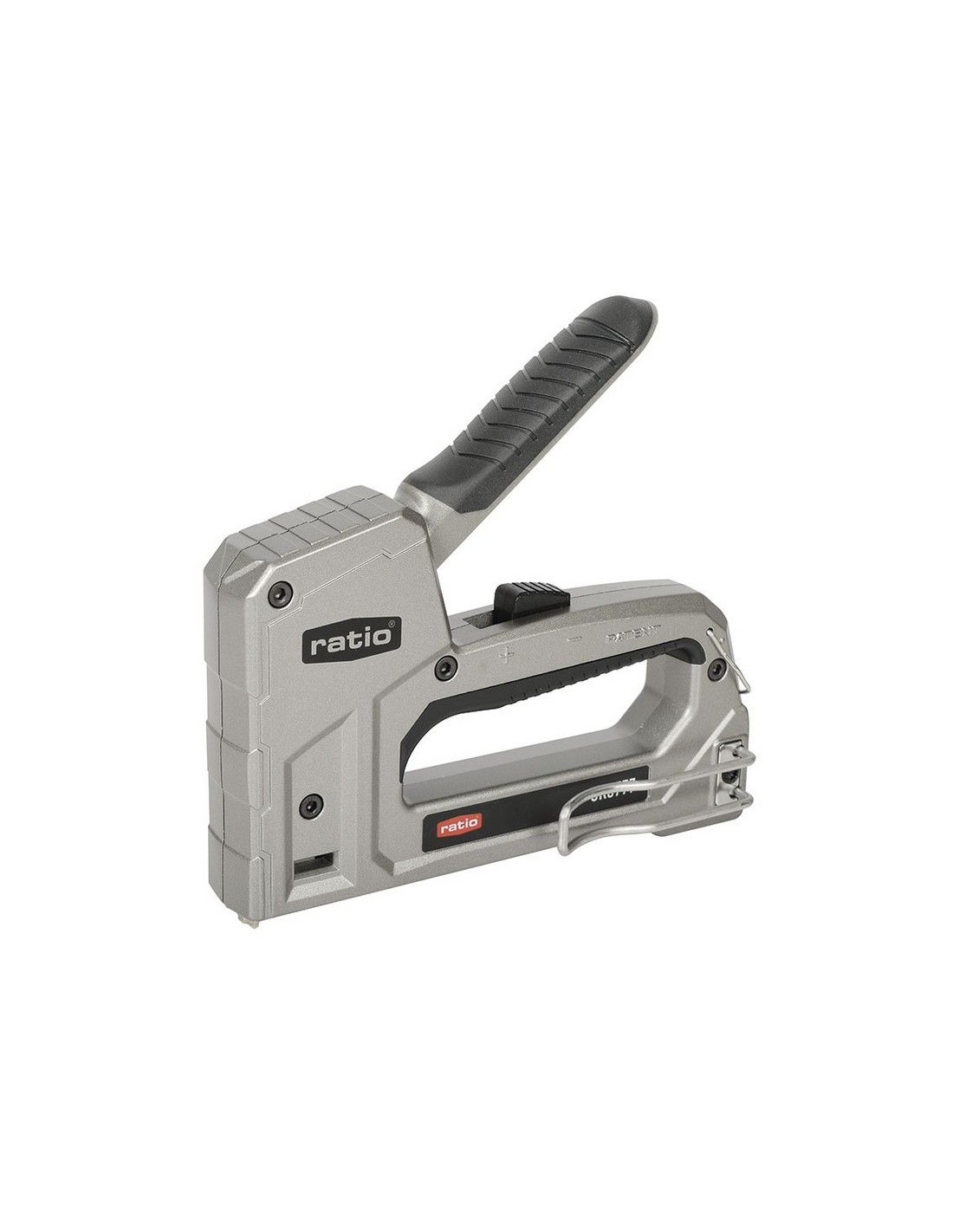 Clavadora 6en1 RATIO CR6777 Carcasa bimaterial de aluminio y mécanica de acero. Regulador de fuerza. Ventana con visor de grapas y puntas. Bloqueo del mango para mayor seguridad. Clip de cinturón. Incluye 500 grapas surtidas. Grapas 530 (6-14 mm).