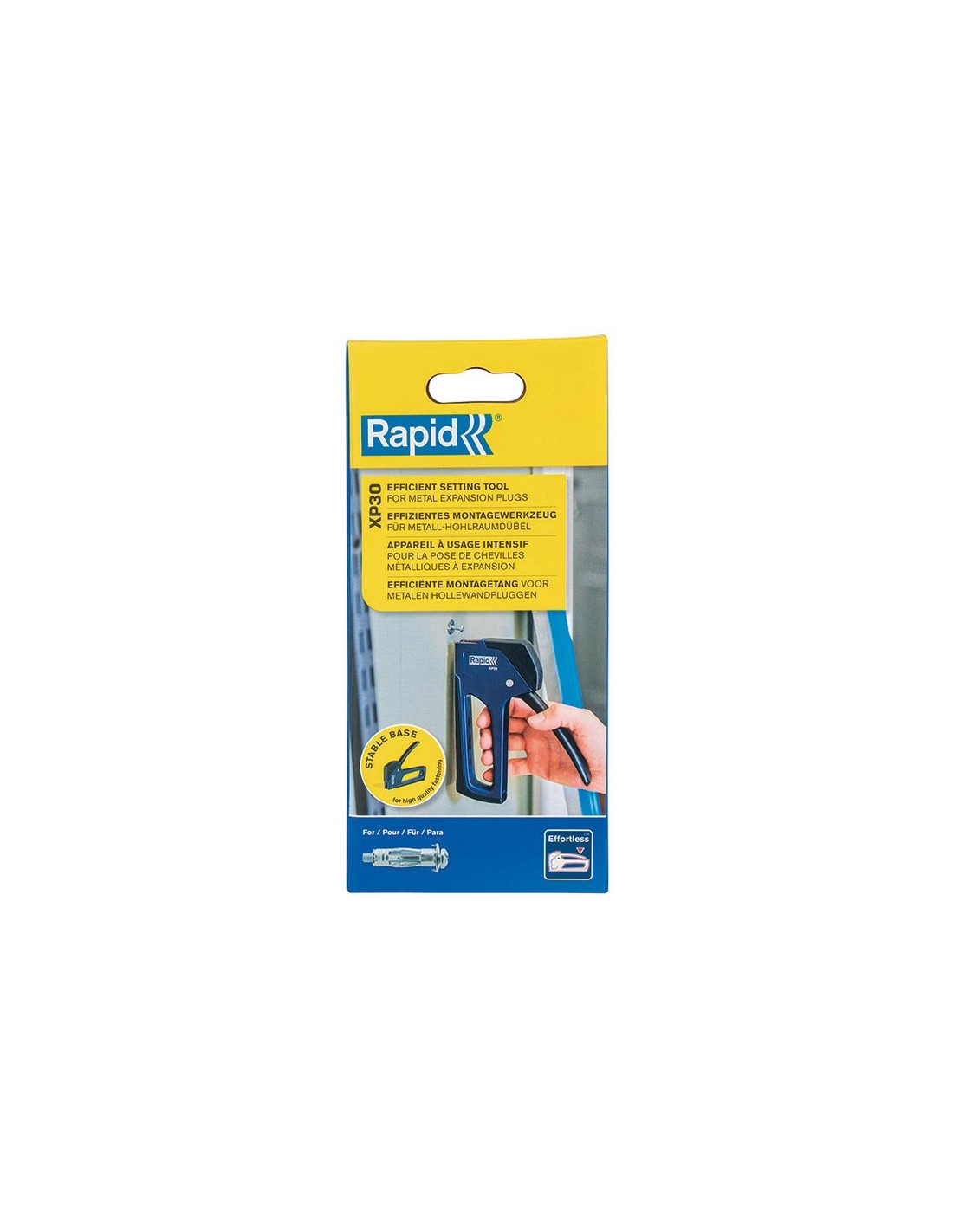 Clavadora fijacón Rapid yeso XP30 Para trabajos intensivos y exigentes de fijación en paredes de yeso huecas, la XP30 de Rapid cumple todos los requisitos. Basándonos en nuestra larga experiencia y en las características ergonómicas de las grapadoras Rapid, hemos diseñado la XP30 para que se ajuste a ras de la pared, creando una base sólida y estable sobre la que aplicar presión y expandir el taco. Esta característica ayuda a garantizar la correcta colocación del taco. La estabilidad mejora aún más gracias a la superficie. de goma antideslizante de la XP30, que también reduce el riesgo de dañar la pared. Ø8, Ø11 y Ø13.