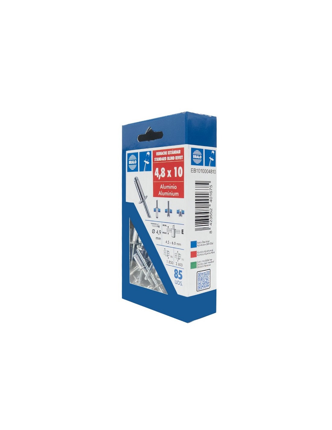 Remache aluminio BRALO (Al Mg 3,5). Vástago acero cincado. Caja Ecoblister. 4,8x10 mm. 85 unid.