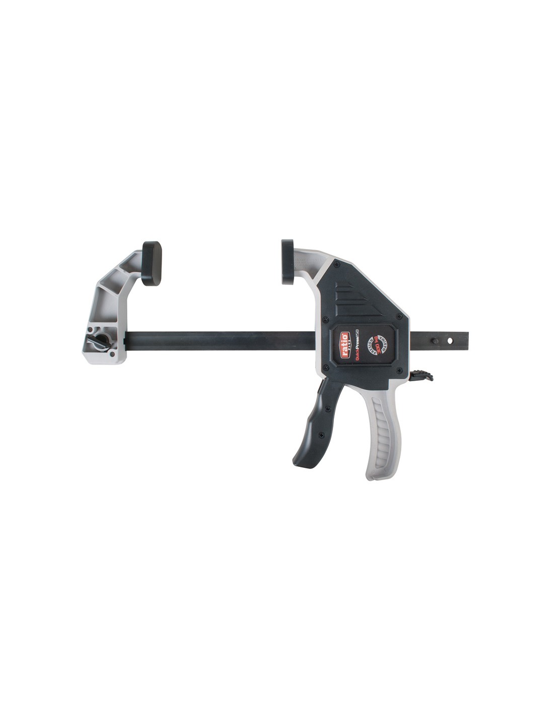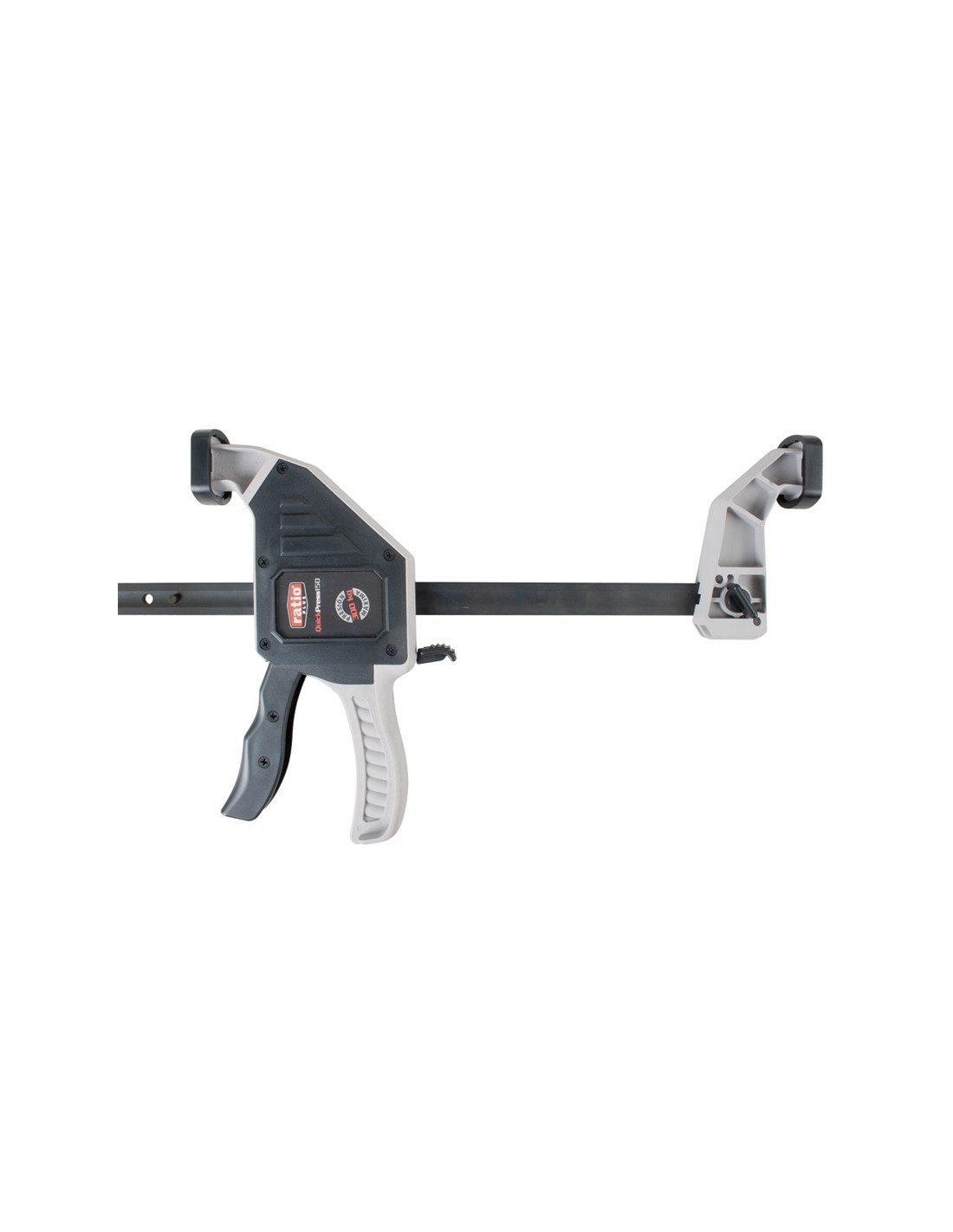 Mordaza apriete reversible RATIO QuickPress. Llanta de acero calibrado. Mecanismo de apriete con palanca de desbloqueo y ajuste rápido. Presión máxima 300 kg. Profundidad mandíbulas: 95 mm. Mordaza reversible. A: máx. 300 mm. B 215-580 mm.