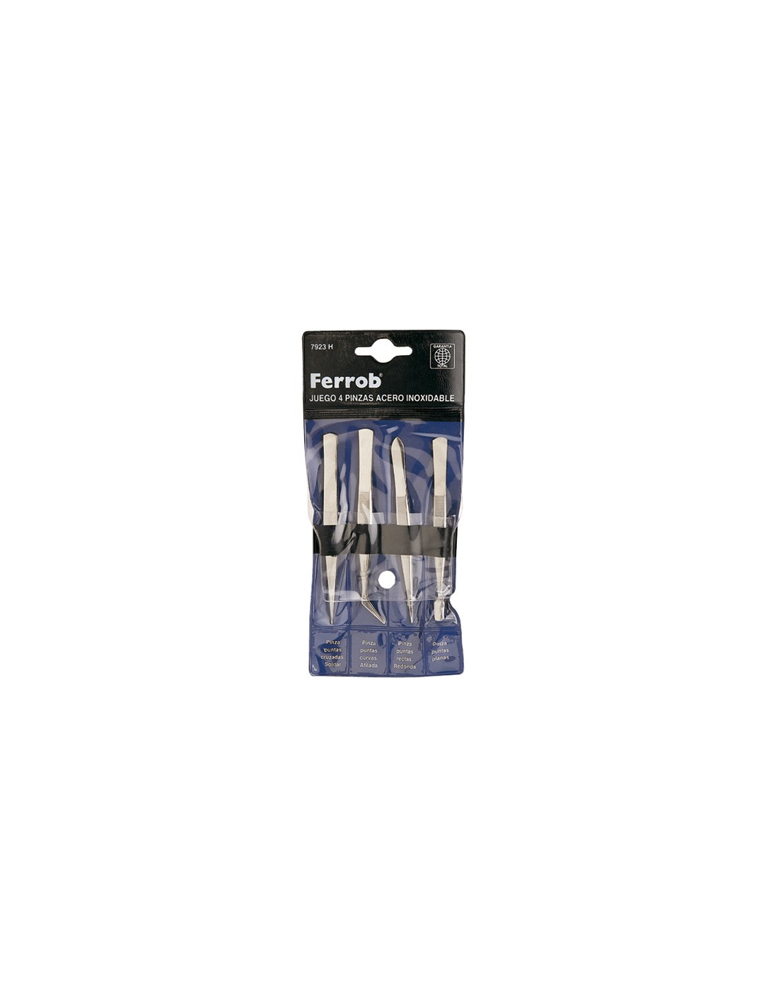 Pinza de precisión FERROB. Acero inoxidable. 4 piezas. Punta cruzada 120 mm. \r\nPunta curva 120 mm. \r\nPunta recta 115 mm.\r\nPunta plana 110 mm.