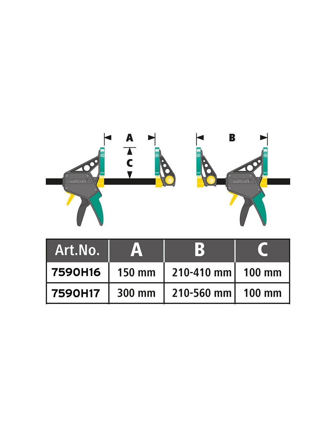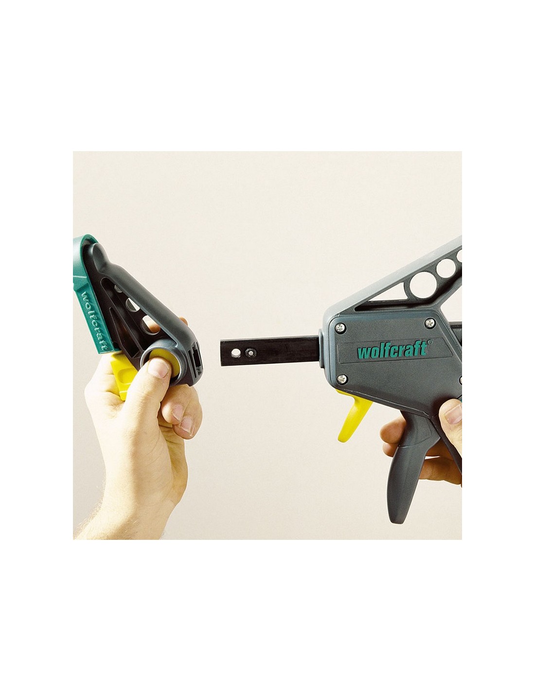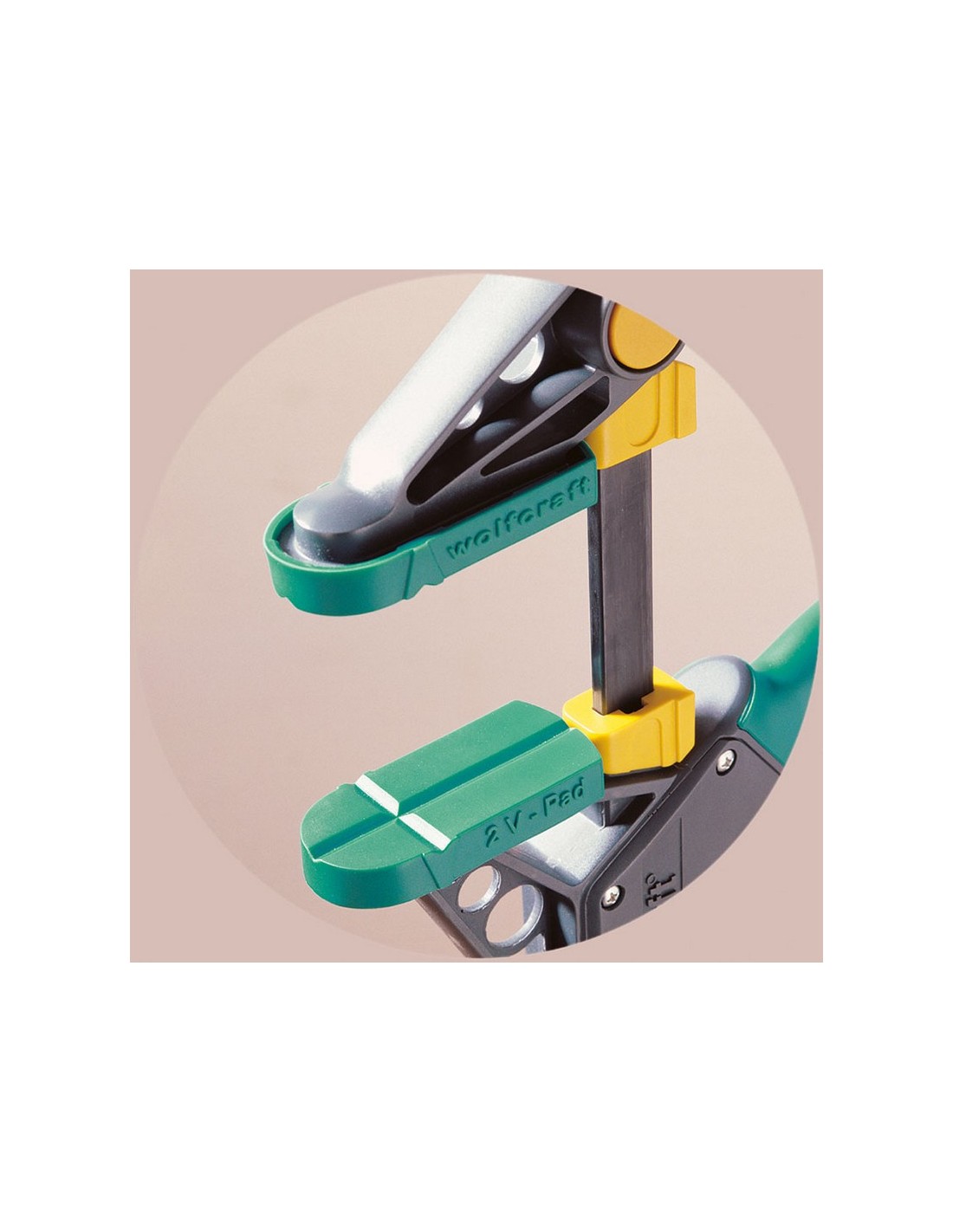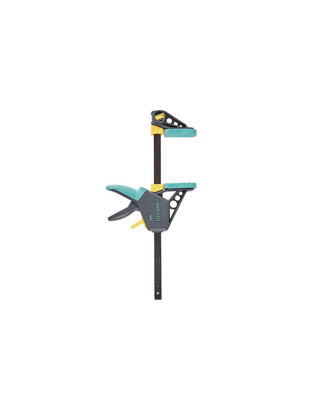 Mordaza apriete WOLFCRAFT Pro L Fuerza de sujeción de hasta 120 kg para un uso versátil. Distribución uniforme de la fuerza de sujeción sin dañar la pieza gracias a las superficies de sujeción de gran tamaño recubiertas de goma y su gran alcance de 100 mm. 300 mm.