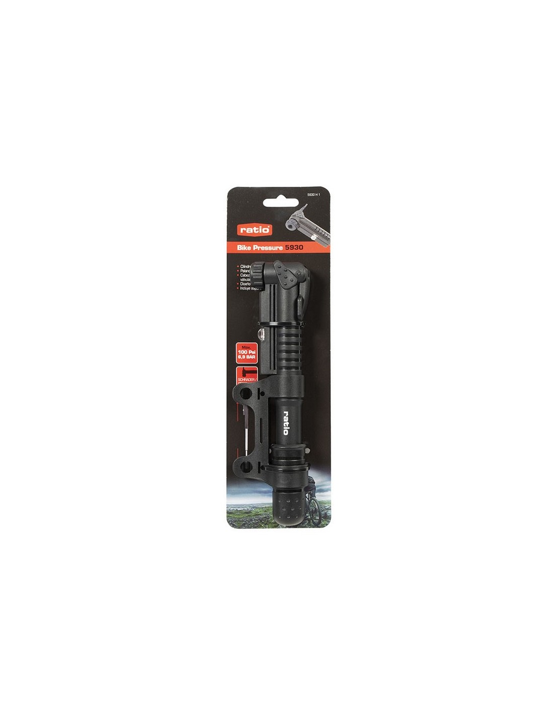 Bomba inflar RATIO Bike Pressure 5930 9". Cilindro de aluminio. Compacta y ligera. Telescópico. Con palanca de bloqueo. Cabezal reversible para válvulas Schrader y Presta. Indicador de presión. Soporte para montaje en bicicleta. Presión máx. 6,9 Bar/ 100 PSI.