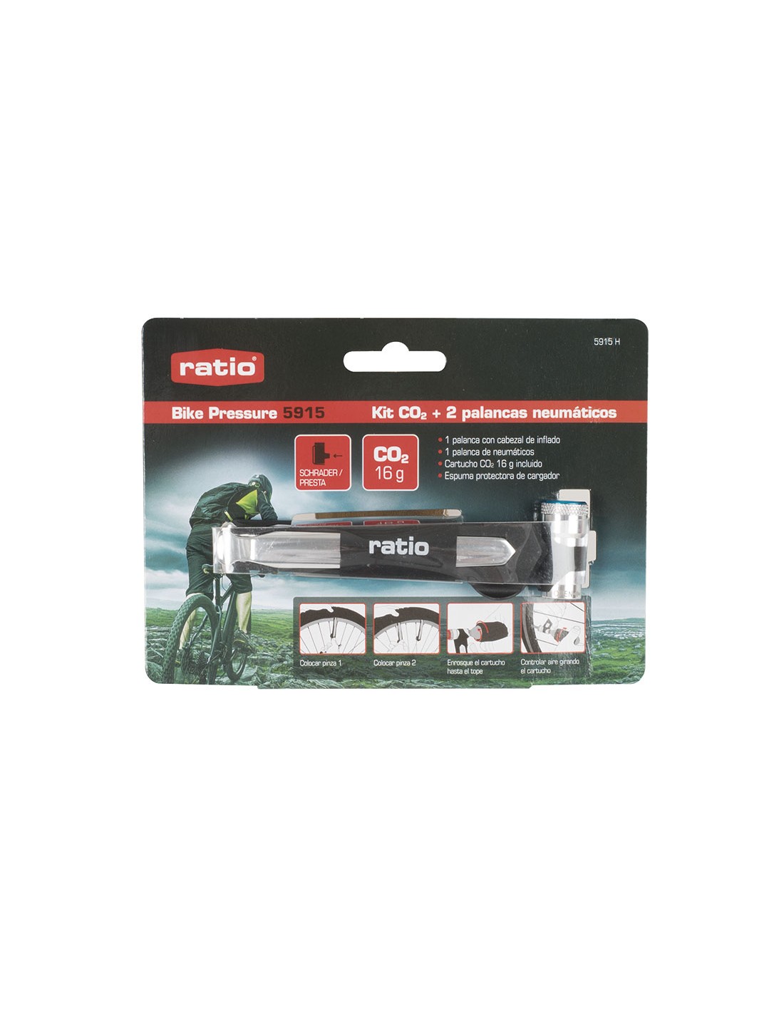 Palancas para cubiertas + cabeza de inflado + cartucho CO² RATIO 5915. Diseño compacto. Control de flujo de aire girando el cartucho. Apto para válvulas Presta y Schrader. Apto para cartuchos de CO² de 16 gr con rosca. Palancas de neumáticos de aluminio con acabado pulido brillante y protector plástico para evitar daños 1 palanca de neumáticos.